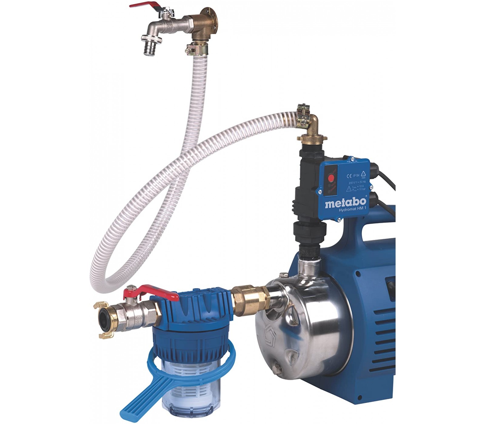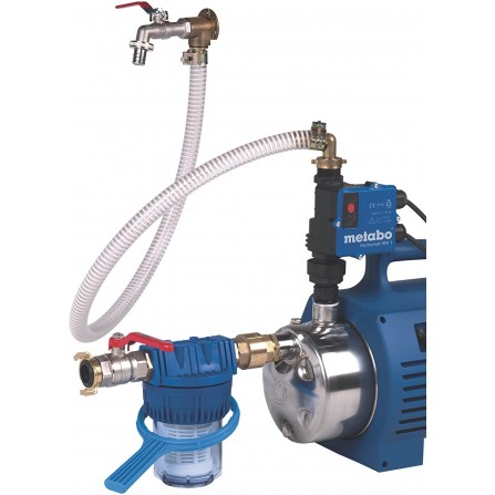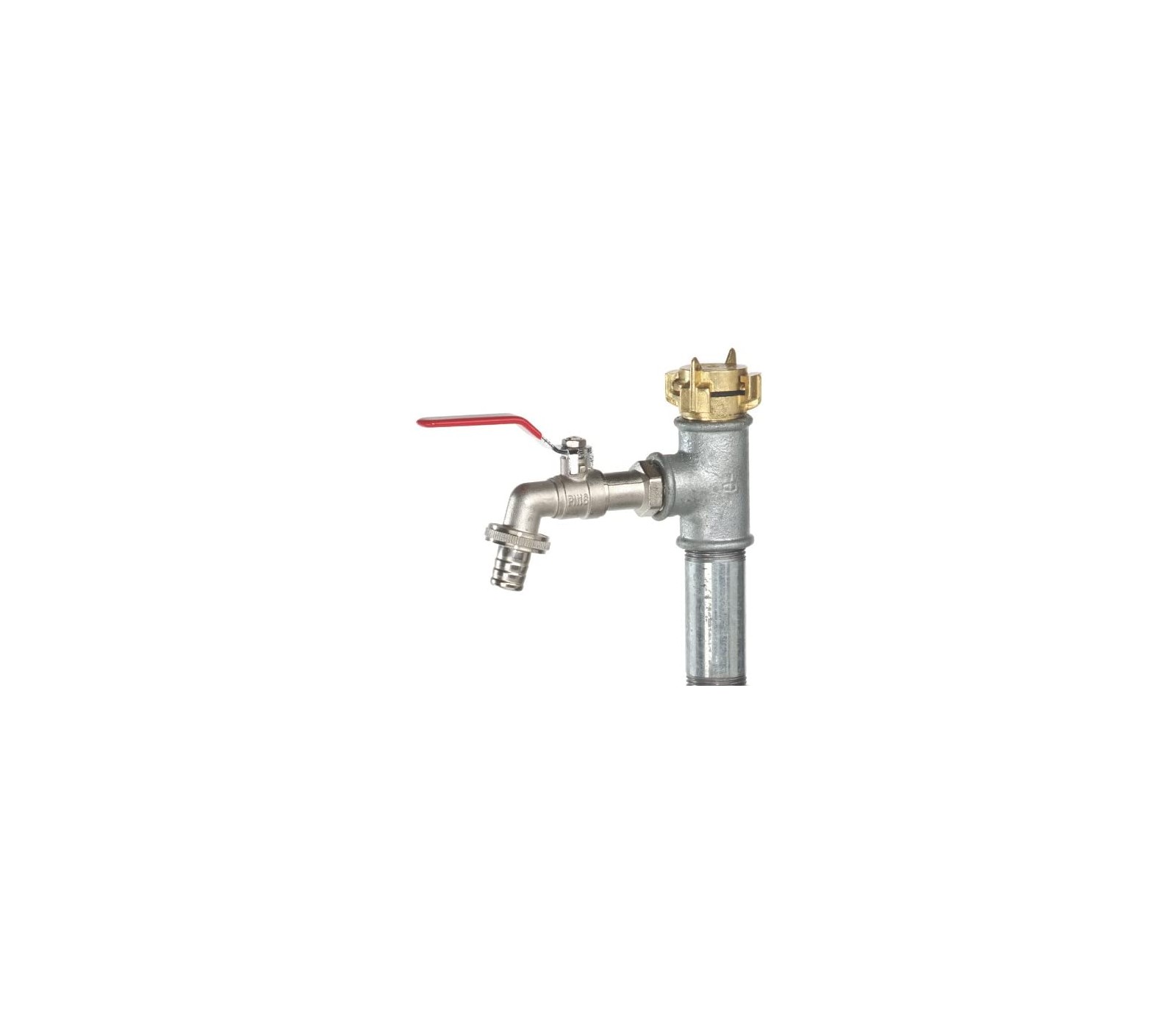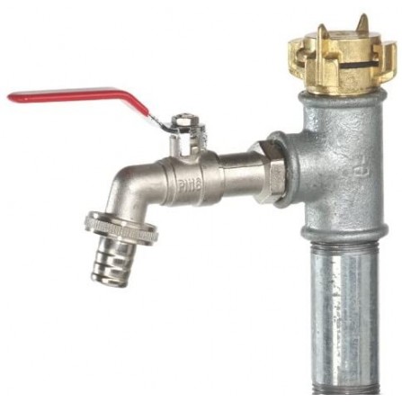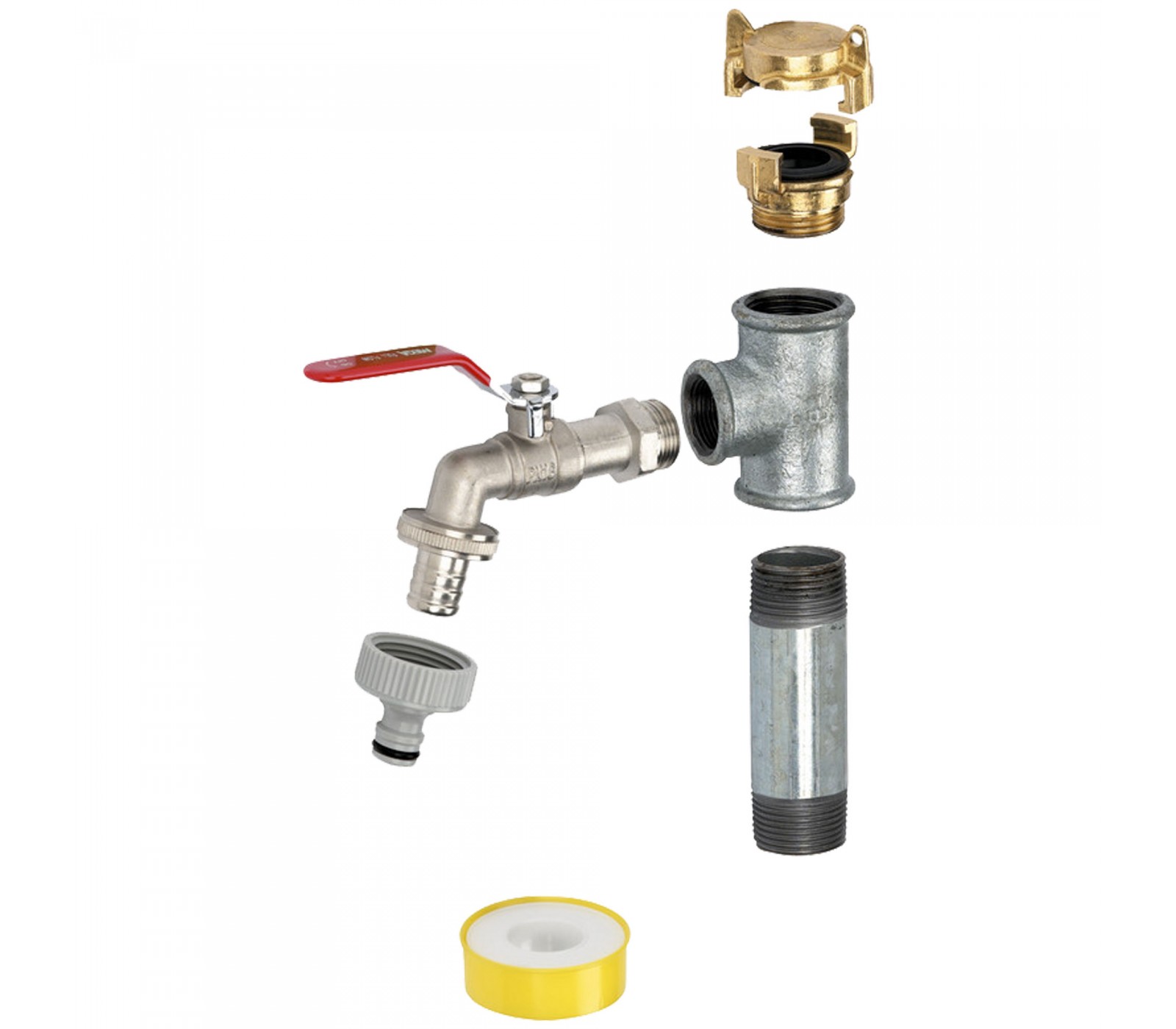 - Gegalvaniseerde pijpnippel; 1'' buitendraad, 100 mm; gegalvaniseerd T-stuk; 1'' x 3/4 x 1'' binnendraad; messing kogelafvoerkraan; kraanconnector; messing koppeling; snelwerkende koppeling; afdichtstrip, 12 jaar oud