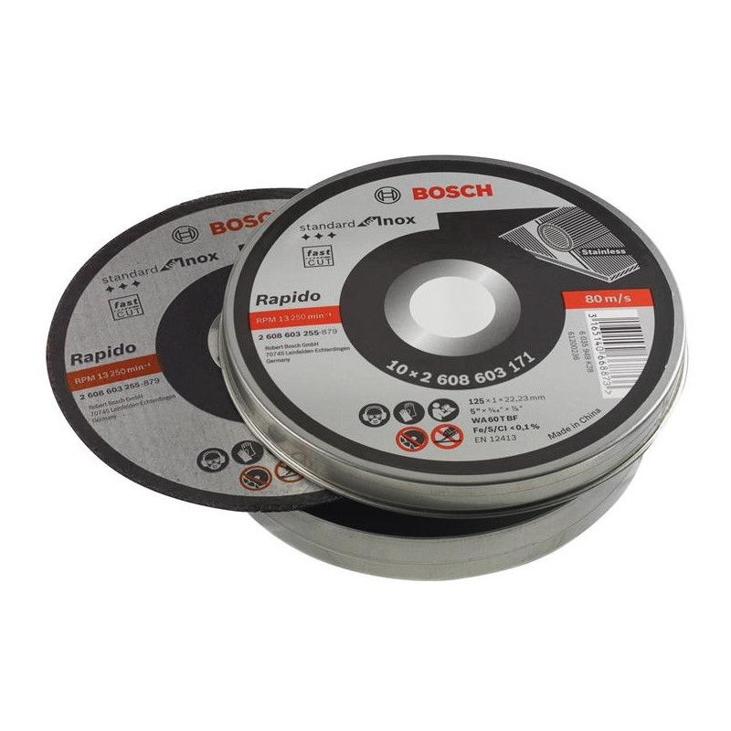 Prekės ženklas- Bosch. Storis- 1 mm. Skersmuo- 125 mm. Vidinės skylės skersmuo- 22.23 mm. Maksimalus sūkių dažnis per minutę- 13250 rpm. Pjovimo greitis- 80 m/s. Disko forma- Tiesus. Apdirbama medžiaga- Nerūdijantysis plienas, Plienas. Vienetai pakuotėje- 10. Papildoma informacija- 10 vienetų. Maksimalus greitis per minutę: 13250 aps./min. Pjovimo greitis: 80 m/s.