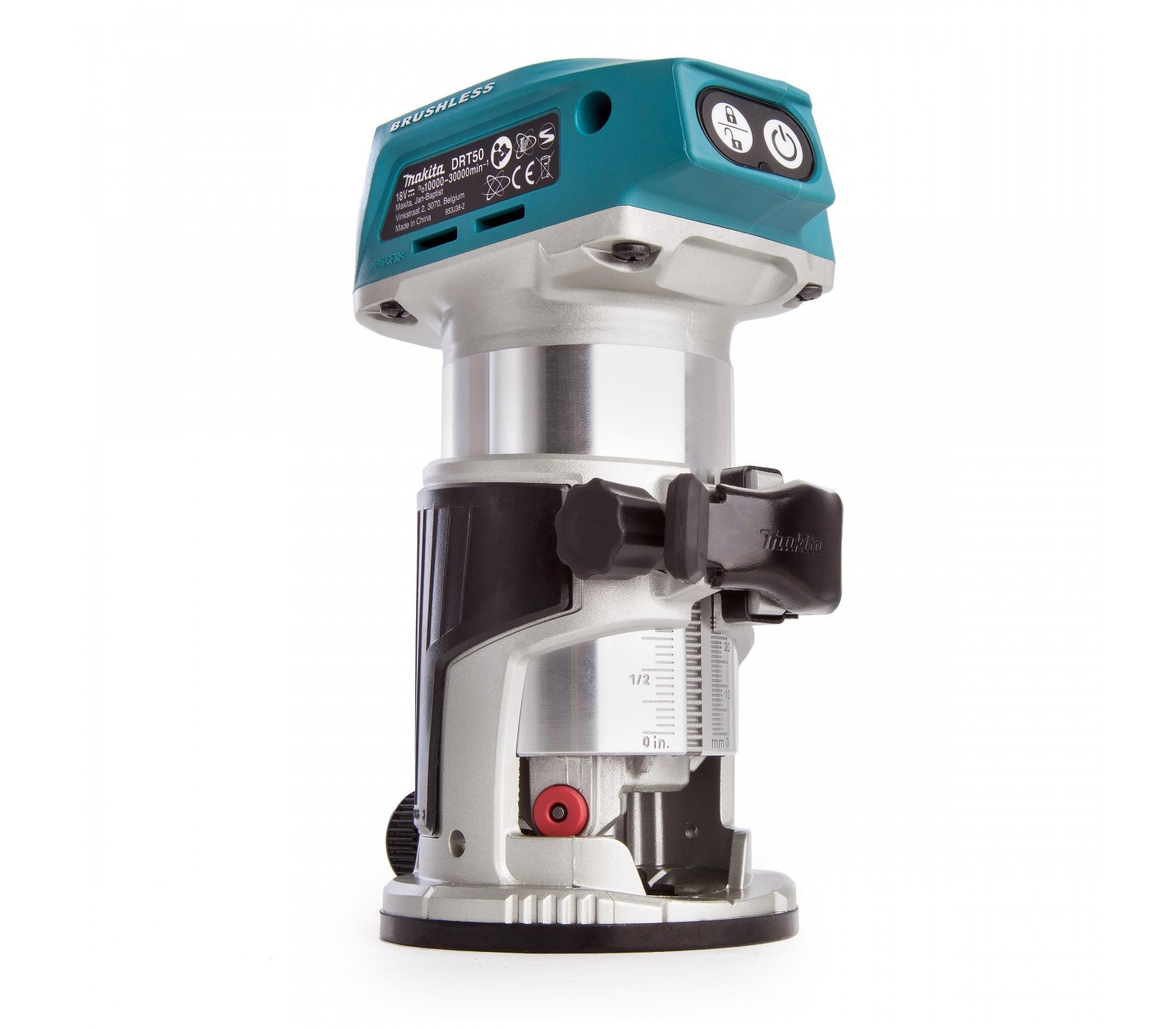 Makita DRT50Z – een hoogwaardig 18 V accu-freesmachine met borstelloze motor, die zorgt voor een langere levensduur en grotere efficiëntie.