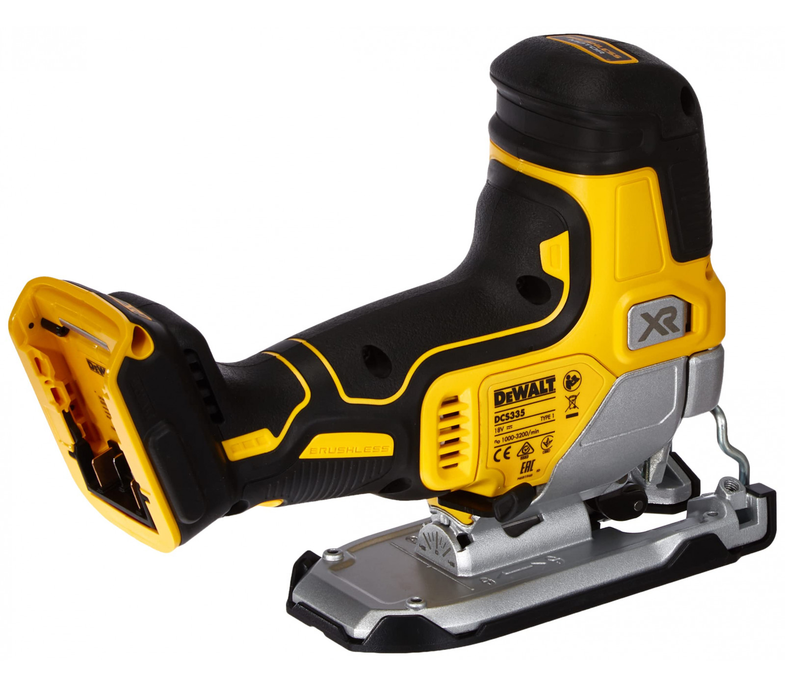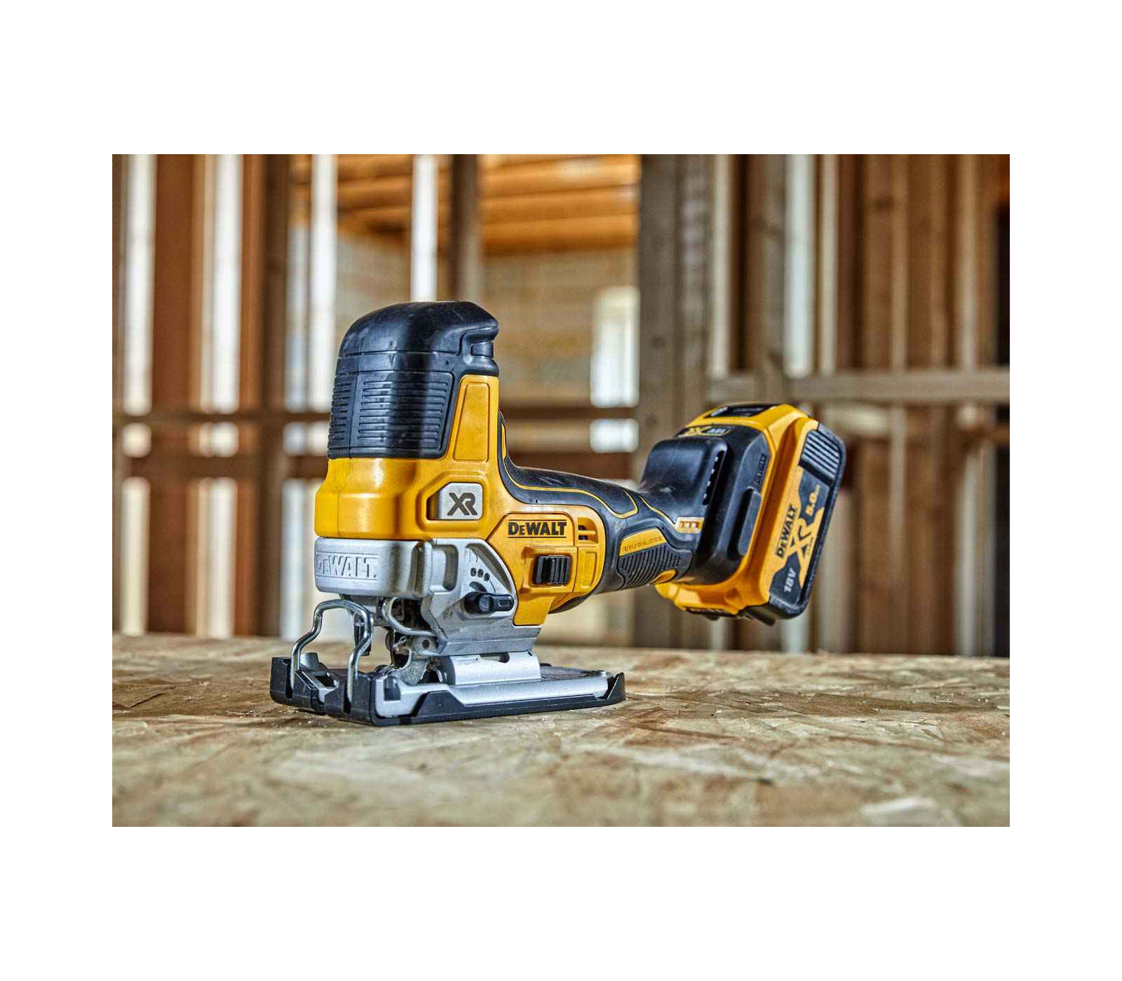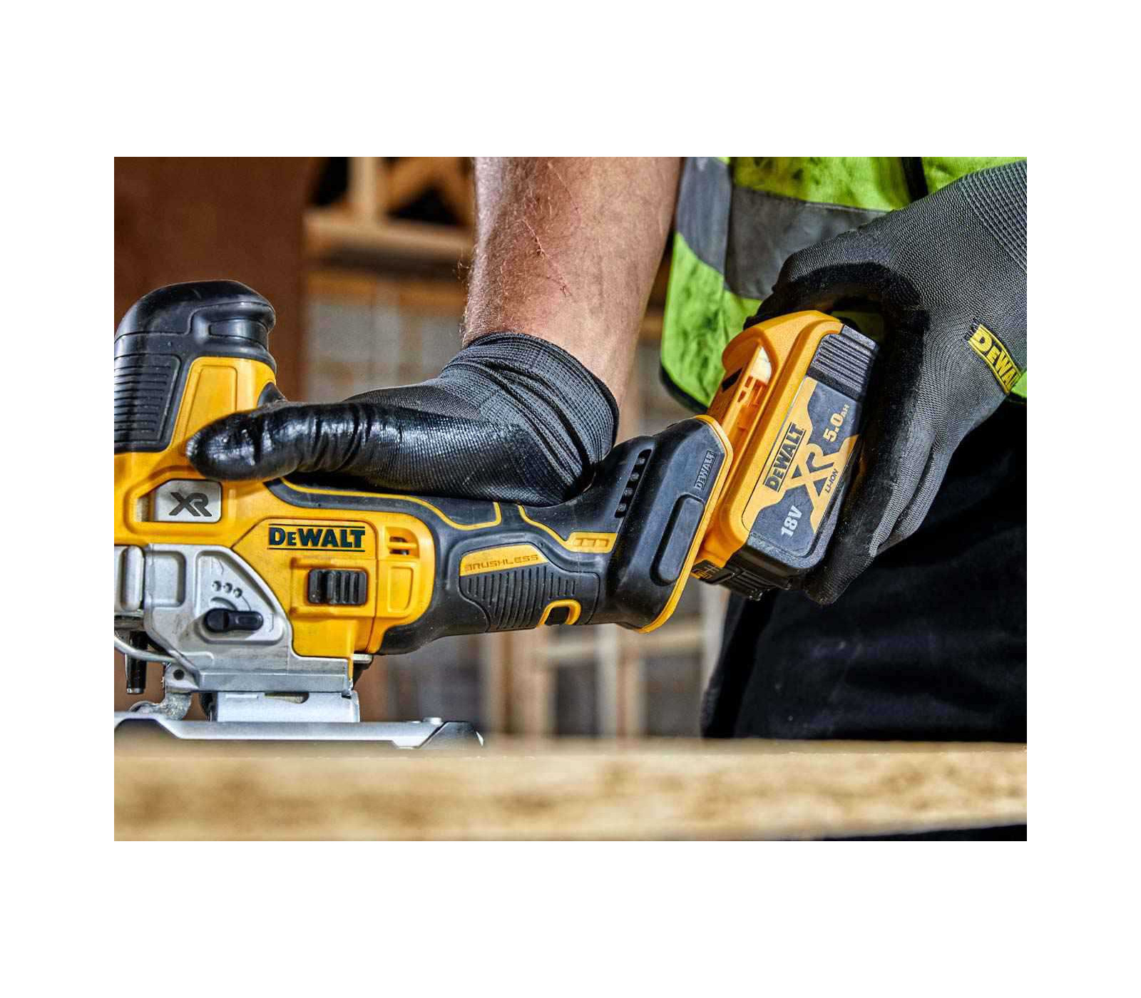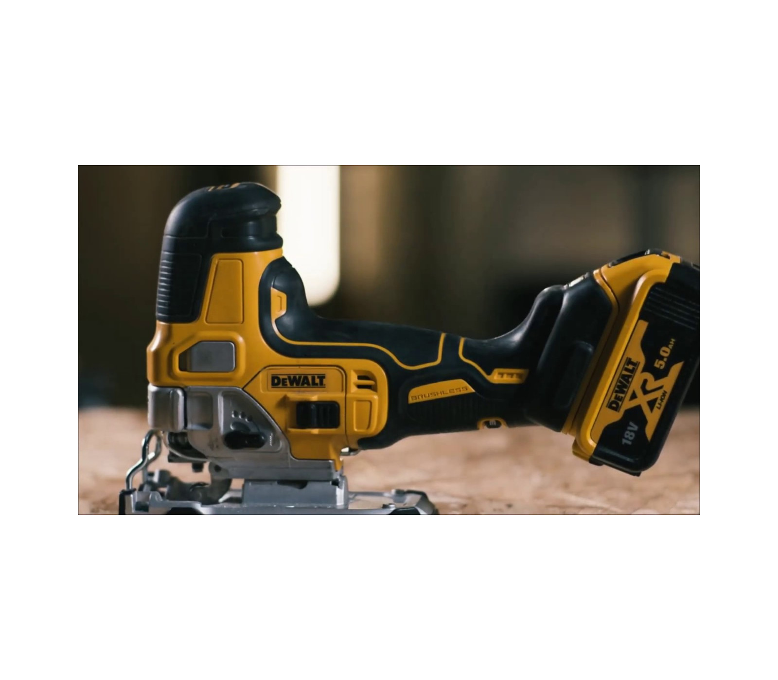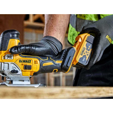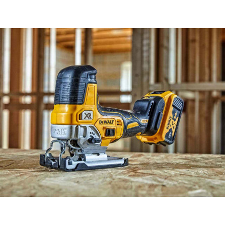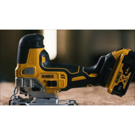 Dewalt akumuliatorinis siaurapjūklis DCS335N su 18V XR bešepečio variklio technologija užtikrina efektyvų ir tikslų pjovimą.