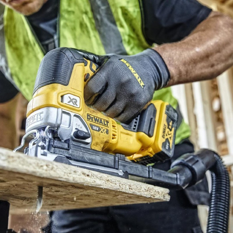 Dewalt DCS334NT-XJ – 18 V akumuliatorinis siaurapjūklis, skirtas tiksliems pjovimo darbams.