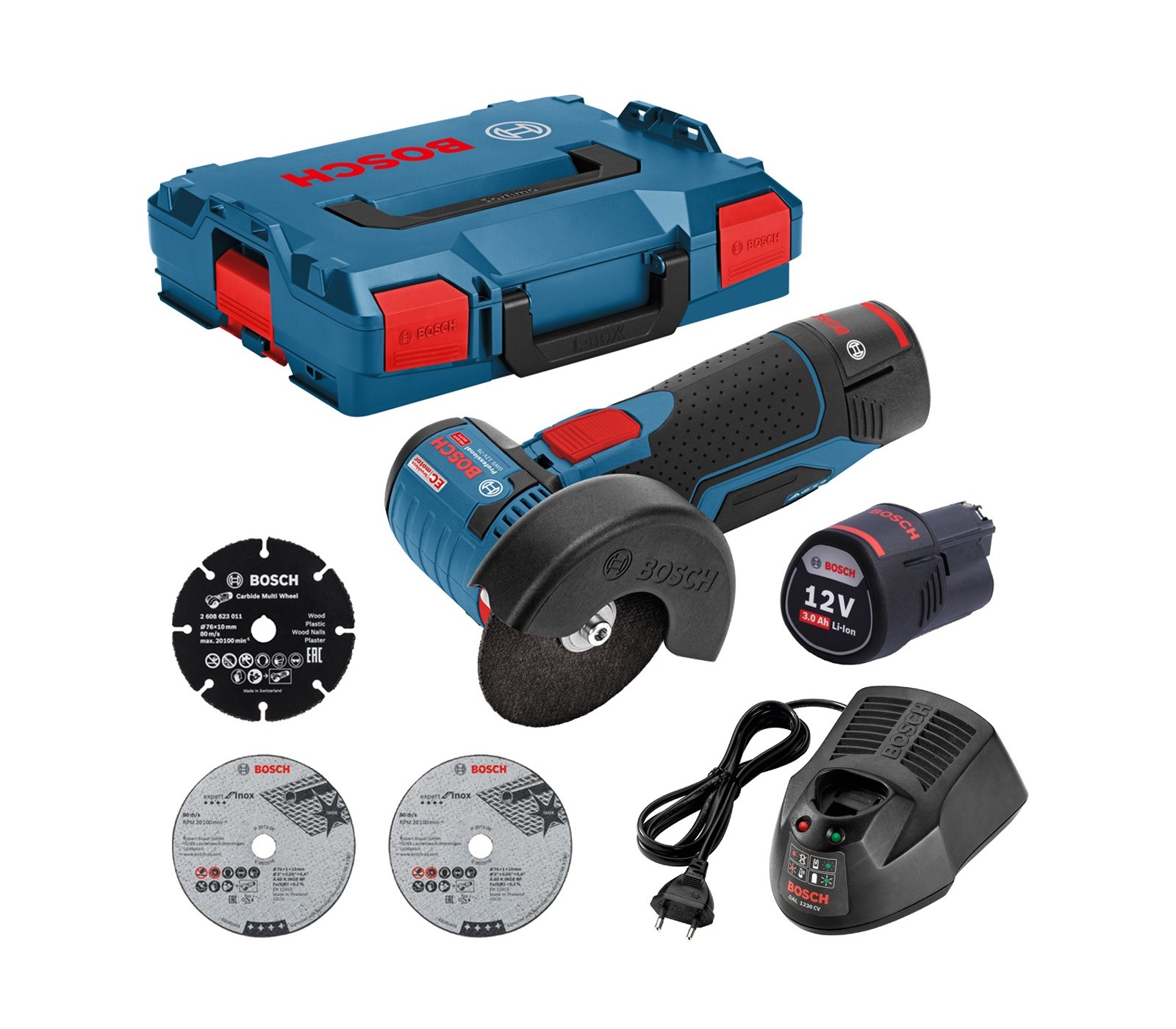 Akumuliatorinio kampinio šlifuoklio Bosch GWS 12V-76 rinkinys, 12 V, 2 x 3 Ah, įkroviklis, lagaminas + 3 diskai