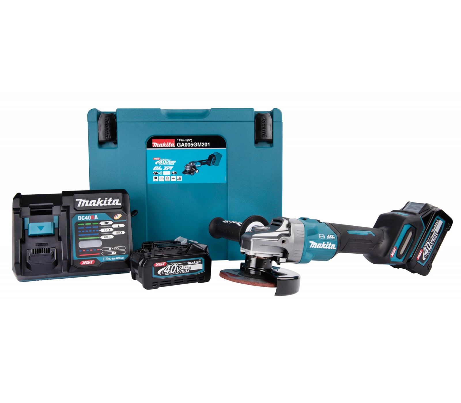 Akumuliatorinio kampinio šlifuoklio Makita GA005GM201 rinkinys, 125 mm, 40 V, 2 x 4 Ah, įkroviklis + lagaminas