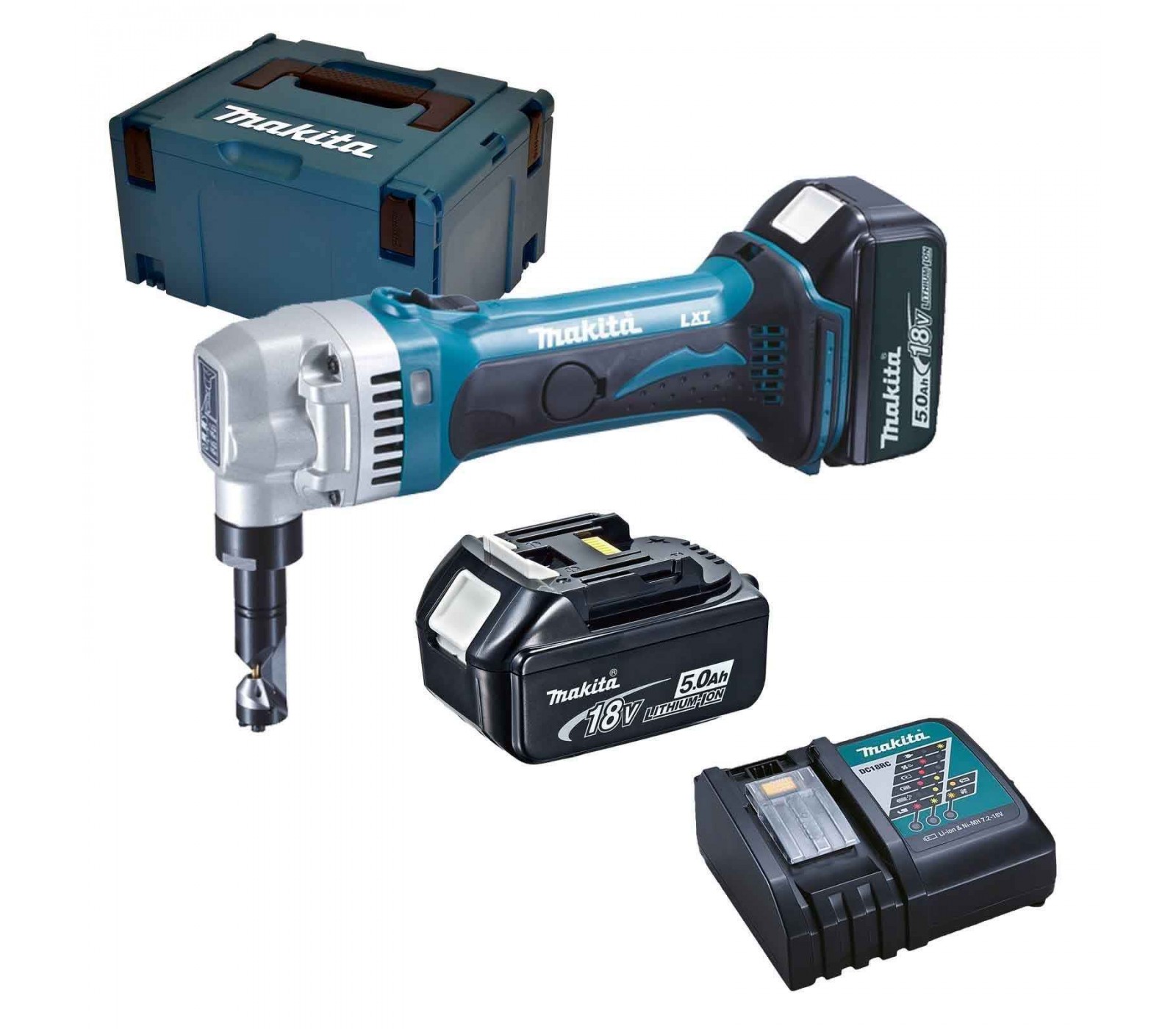 Akumuliatorinių skardos žirklių Makita DJN161RTJ rinkinys, 18 V, 2 x 5 Ah, įkroviklis + lagaminas