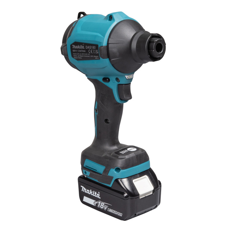 De Makita DAS180Z is een draadloze blazer voor blazen, opblazen en leegzuigen. Werkt met een 18V LXT® Li-Ion accu (niet inbegrepen). Kies uit 4 luchtstanden, regelbaar via de trekker. Borstelvrije motor = minder onderhoud, langere levensduur. Ideaal voor vakman of doe-het-zelver – denk aan garage schoonmaken of luchtbed oppompen. Luchtsnelheid tot 200 m/s, gewicht 1,2–1,7 kg, werktijd tot 55 min (6.0Ah accu).