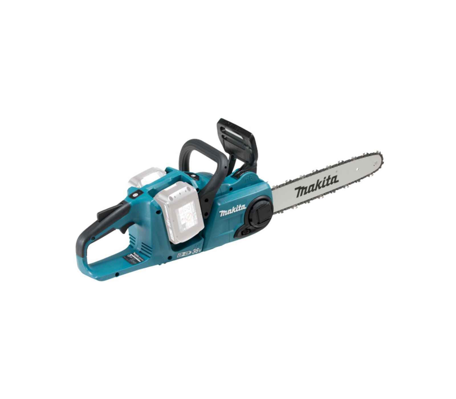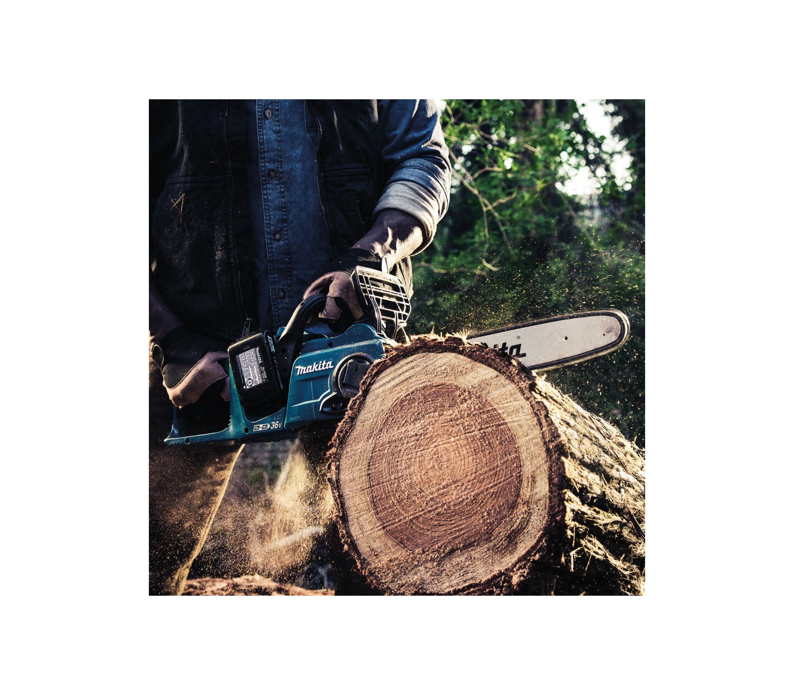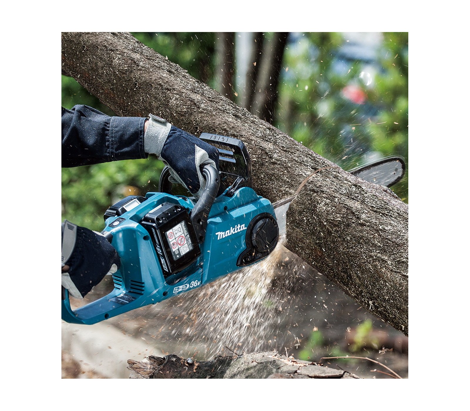 Makita DUC353Z – galingas 36 V akumuliatorinis grandininis pjūklas, naudojantis du 18 V LXT akumuliatorius.