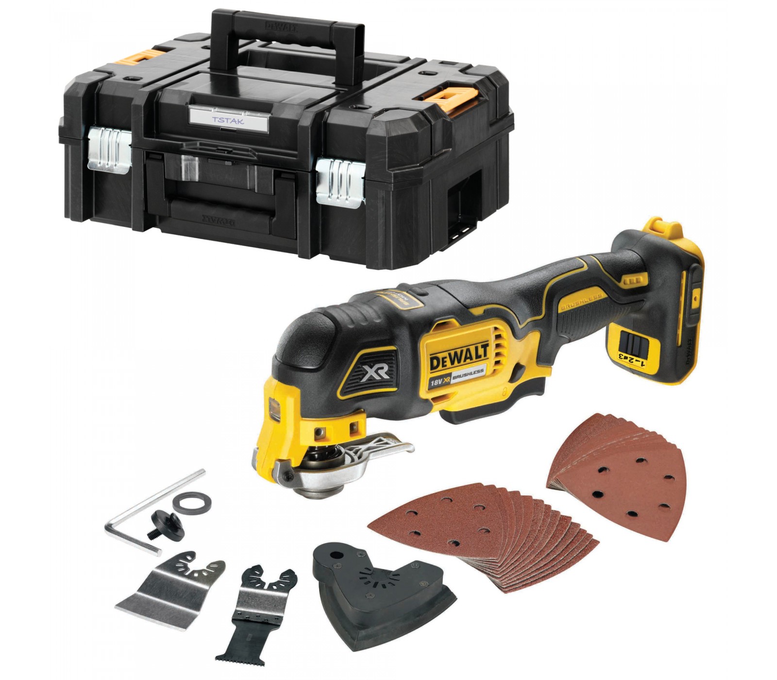 Dewalt DCS356NT 18V daugiafunkcinis įrankis su lagaminu ir priedais yra universalus ir ergonomiškas sprendimas įvairiems darbams.