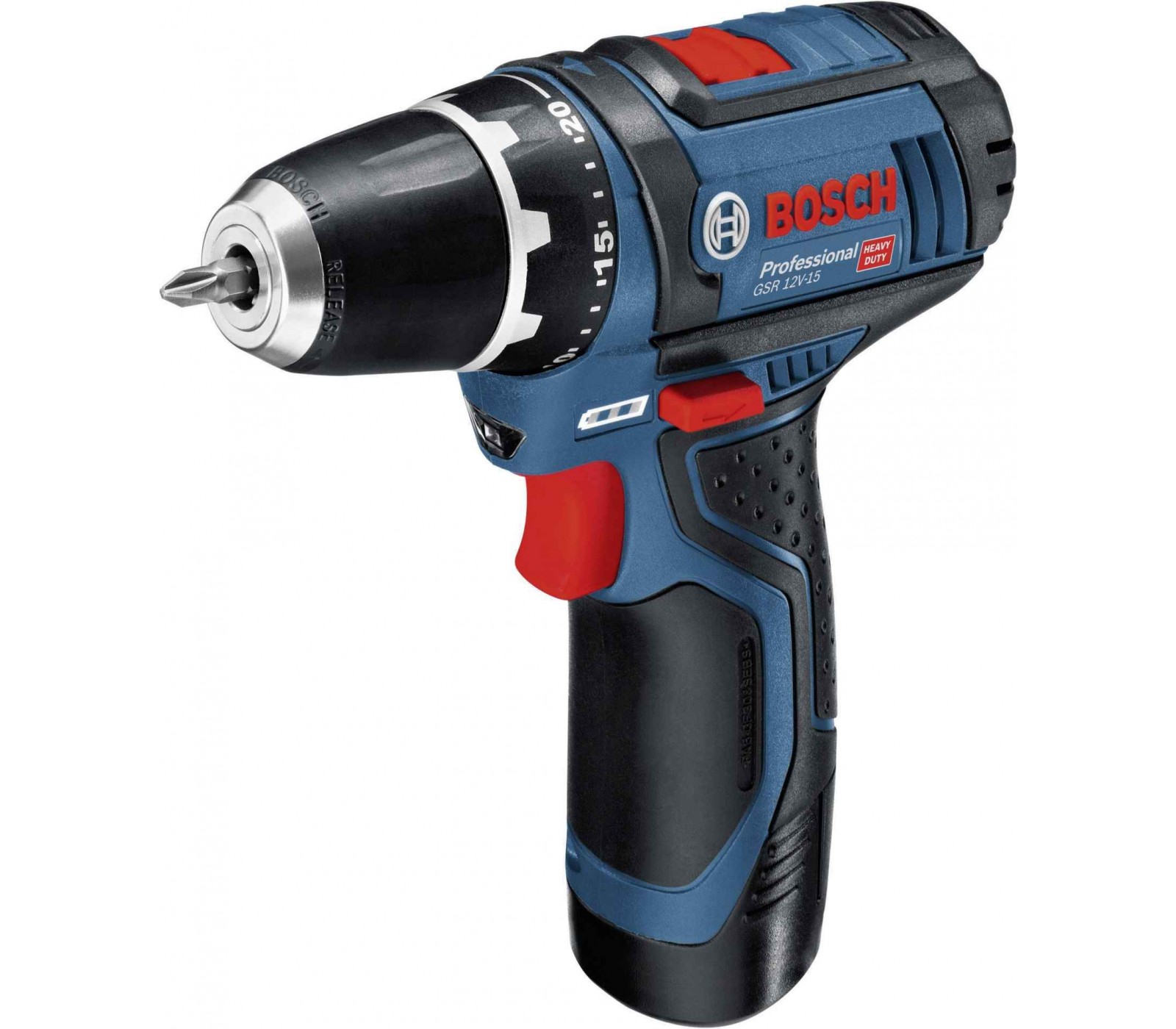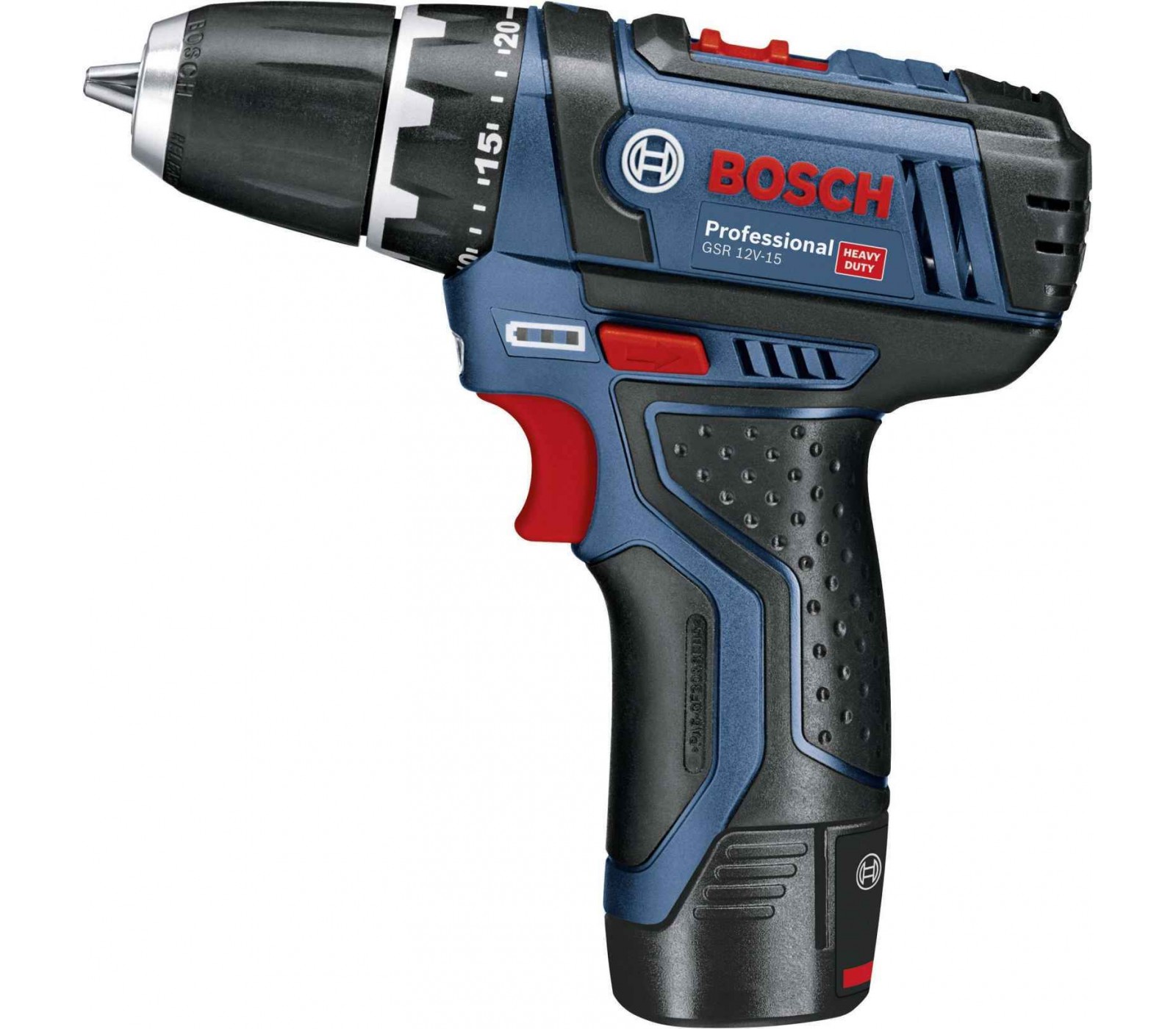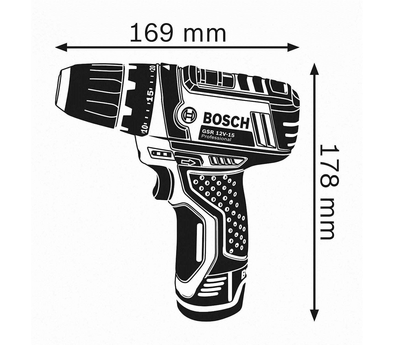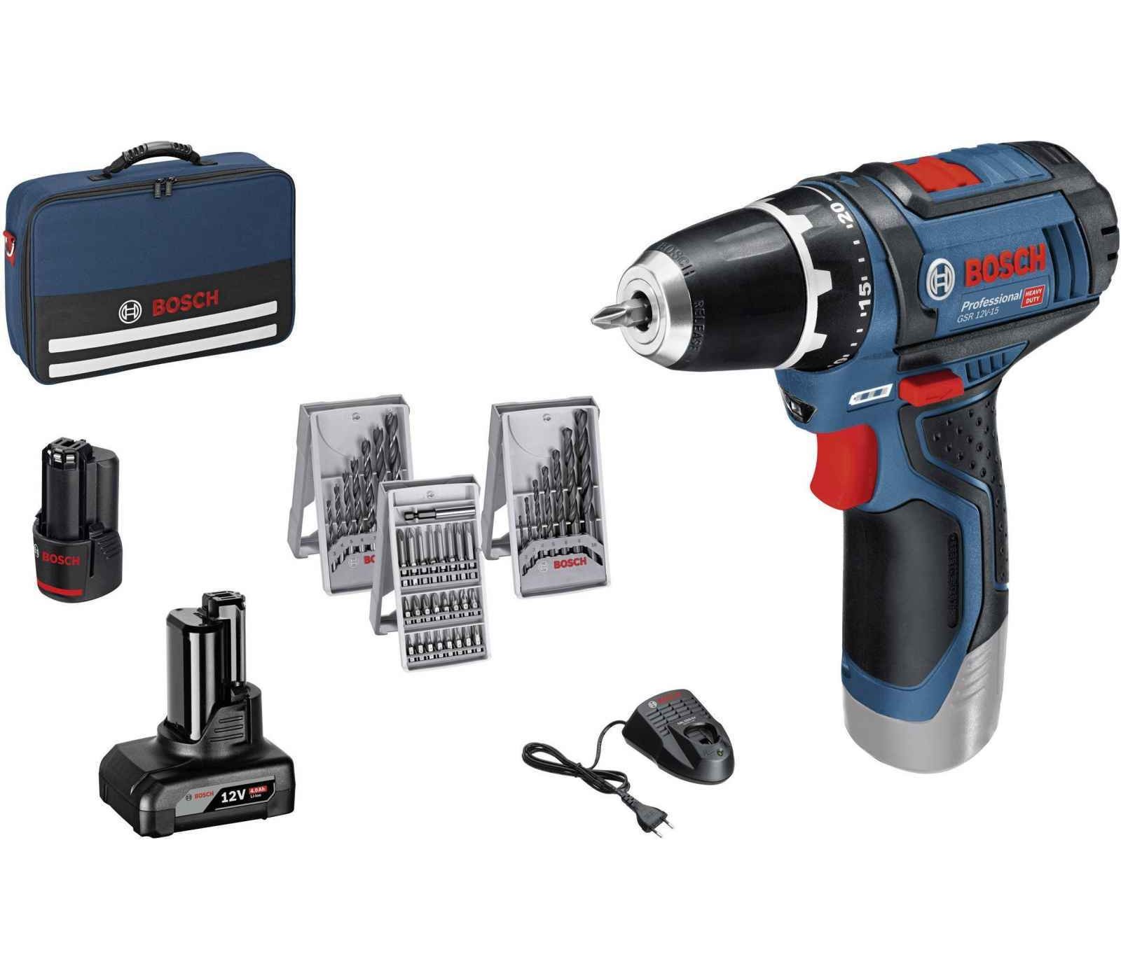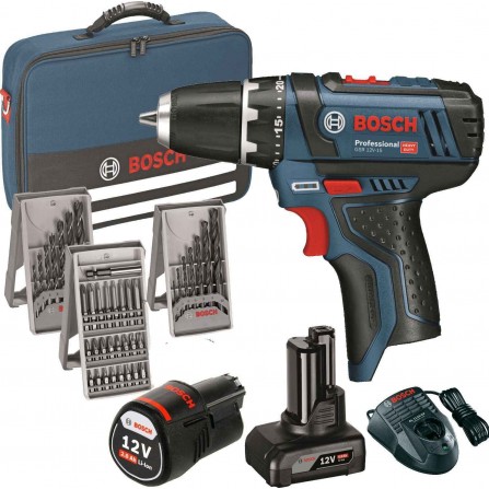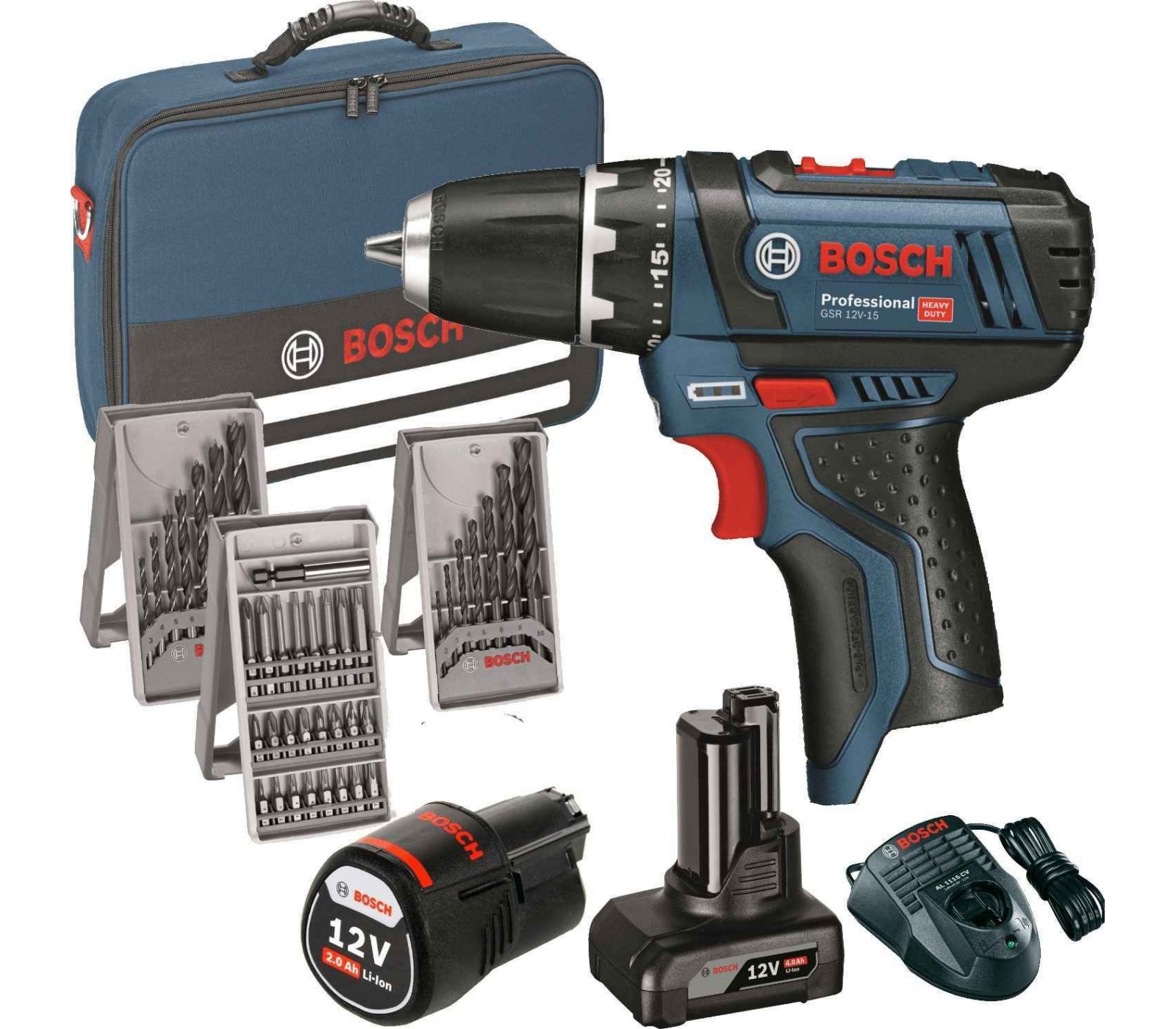 Akumuliatorinio gręžtuvo-suktuvo Bosch GSR 12V-15 FC rinkinys, 12 V, 1 x 4 Ah, 1 x 2 Ah, įkroviklis, krepšys + priedai 175 vnt.
