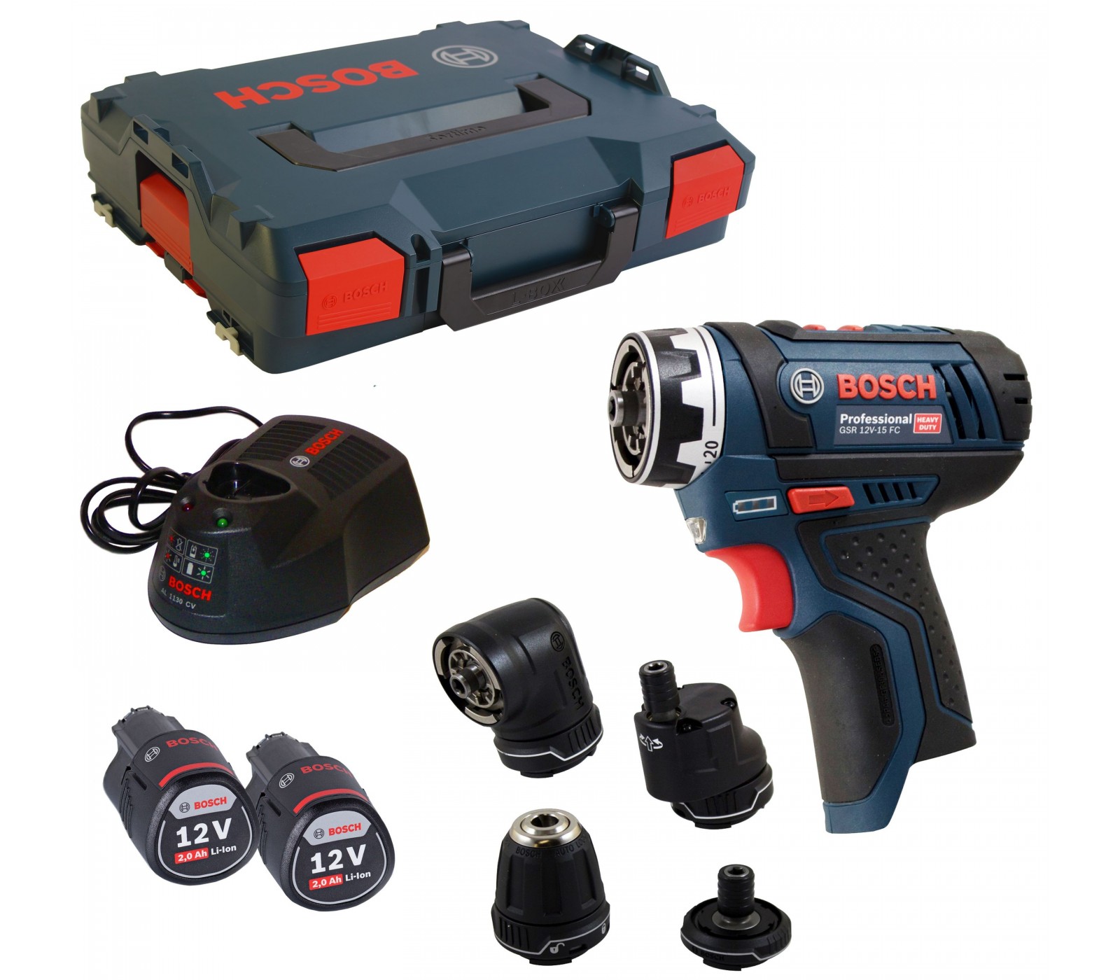 Akumuliatorinio suktuvo Bosch GSR 12V-15 FC rinkinys, 12 V, 2 x 2 Ah, įkroviklis, lagaminas + 4 griebtuvai
