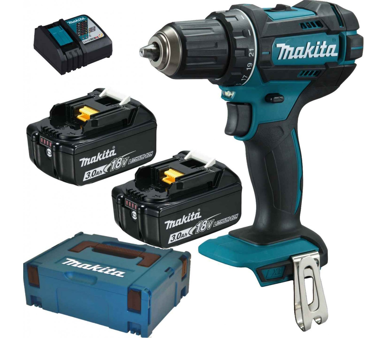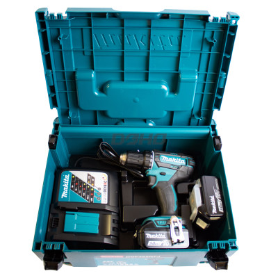 Makita DDF482RFJ rinkinys su 18 V suktuvu, 2 x 3 Ah akumuliatoriais, įkrovikliu ir lagaminu – idealus sprendimas profesionaliems darbams.