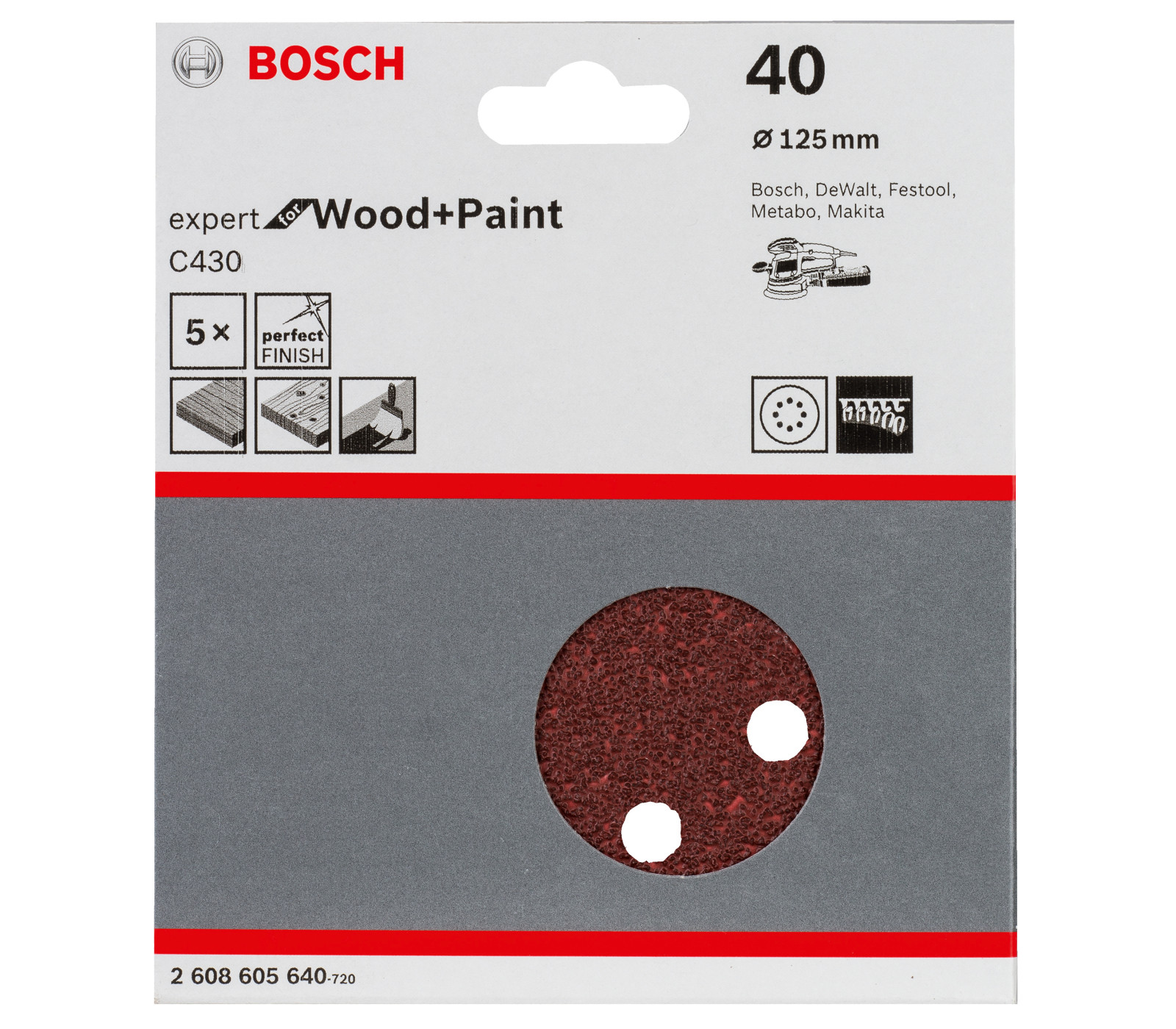 Bosch šlifavimo popierius C430, 125 mm, 40 grūdėtumas, 5 vnt.