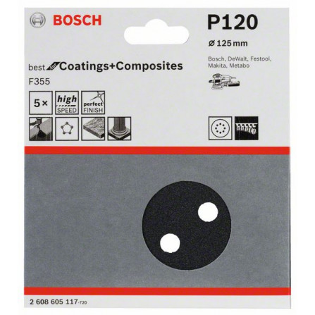 Bosch šlifavimo popierius F355, 125 mm, 120 grūdėtumas, 5 vnt.
