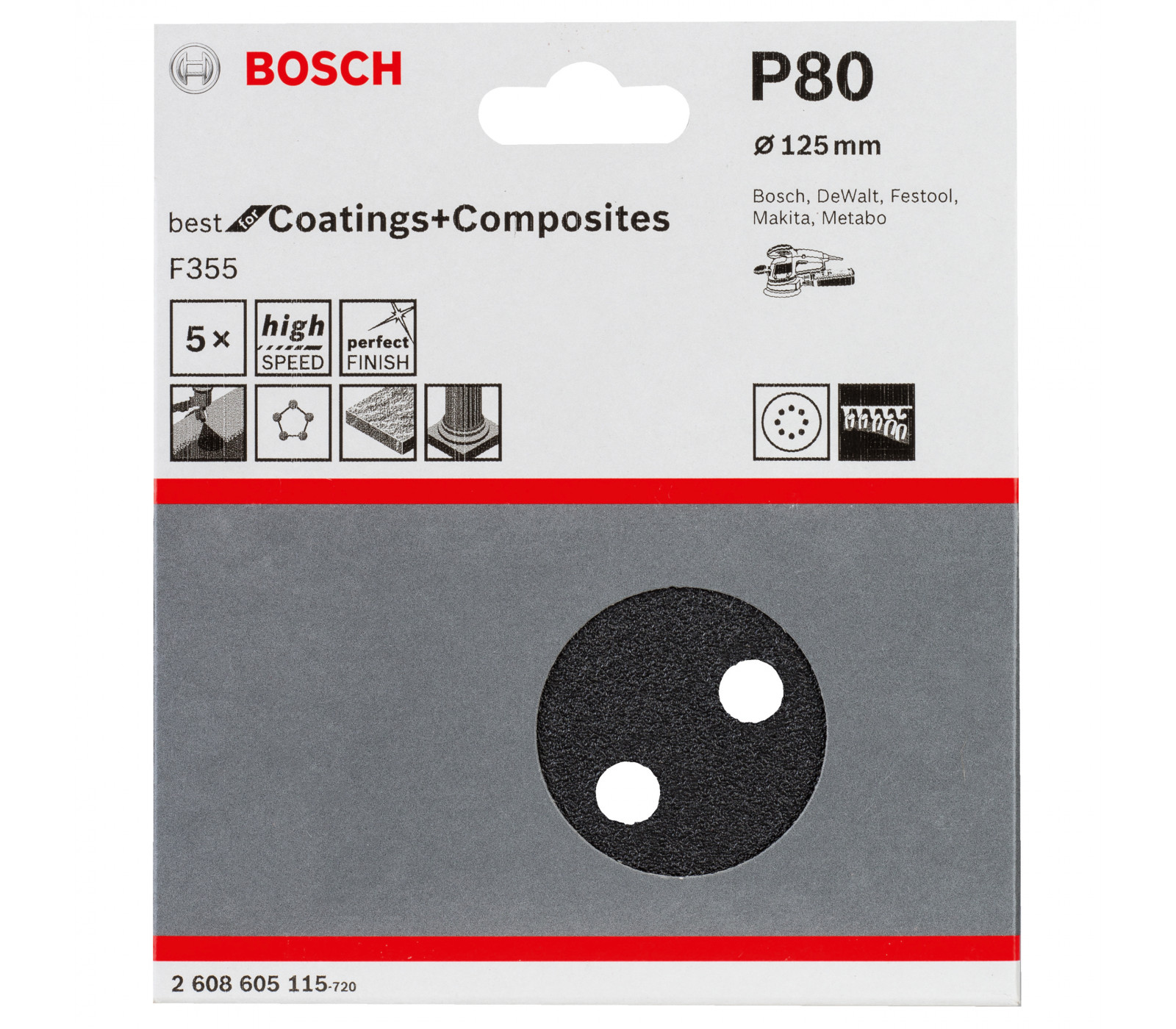 Bosch šlifavimo popierius F355, 125 mm, 80 grūdėtumas, 5 vnt.