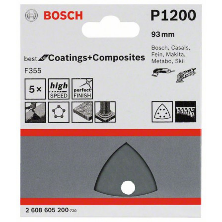 Bosch šlifavimo popierius F355, 93 mm, 1200 grūdėtumas, 5 vnt.