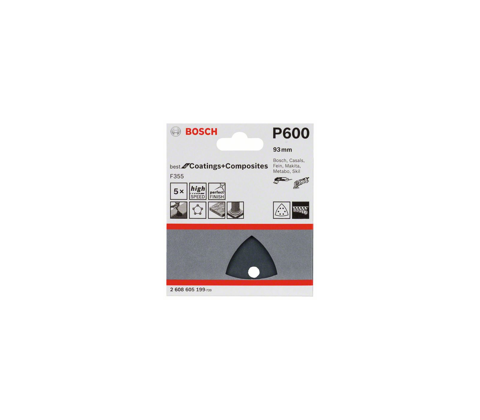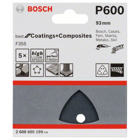 Bosch šlifavimo popierius F355, 93 mm, 600 grūdėtumas, 5 vnt.