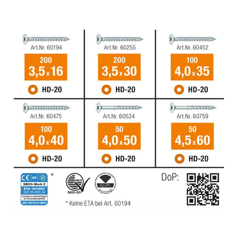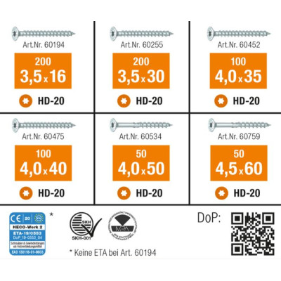 - 200 x 3,5 x 16 mm, 100 x 3,5 x 30 mm, 100 x 4,0 x 35 mm, 100 x 4,0 x 40 mm, 50 x 4,5 x 50 mm, 50 x 4,5 x 60 mm, 2x HD-20 bit, 1x HECO Assortimentskoffer L-BOXX Mini incl. scheidingssysteem
