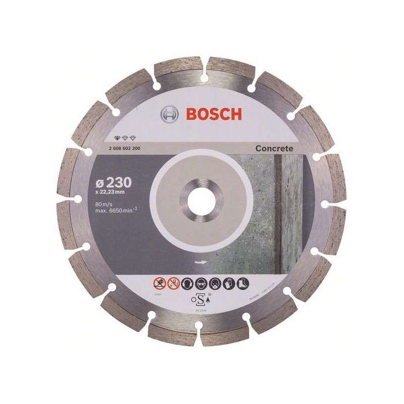 Prekės ženklas- Bosch. Artikulas- 2608602200. Skersmuo- 230 mm. Vidinės skylės skersmuo- 22.23 mm. Storis- 2.3 mm. Svoris- 0.620 kg. Deimantinio disko tipas- Segmentinis. Apdirbama medžiaga- Betonas. Tinka pjovimui- Sausam. Vienetai pakuotėje- 1. Segmento aukštis- 10 mm. Maksimalus sūkių dažnis per minutę- 6650 rpm. Pjovimo greitis- 80 m/s. Tinka įrankiams- Kampiniams šlifuokliams. Papildoma informacija- Maksimalus greitis per minutę: 6650 aps./min. Segmento aukštis: 10 mm. Tinka pjauti: Sausai. Svoris: 0,620 kg.
