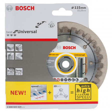 De universële diamantzaagschijf van Bosch is speciaal ontworpen voor veelzijdig gebruik, met een maat van 115 x 22,23 x 2,6 mm. Deze schijf biedt een uitstekende snijkwaliteit voor verschillende materialen, waardoor het een ideale keuze is voor zowel professionals als doe-het-zelvers.