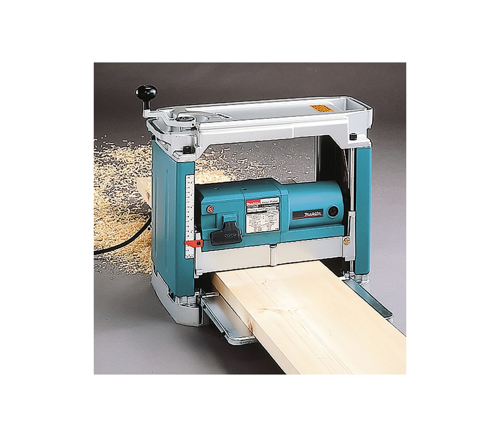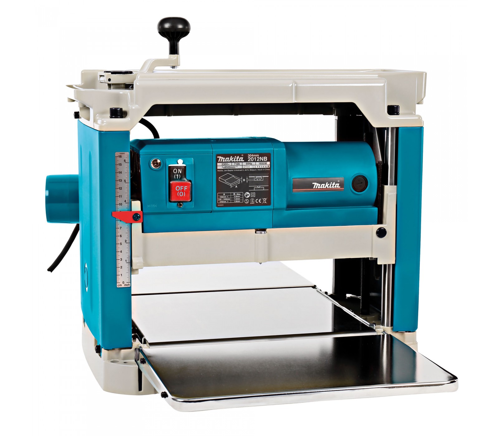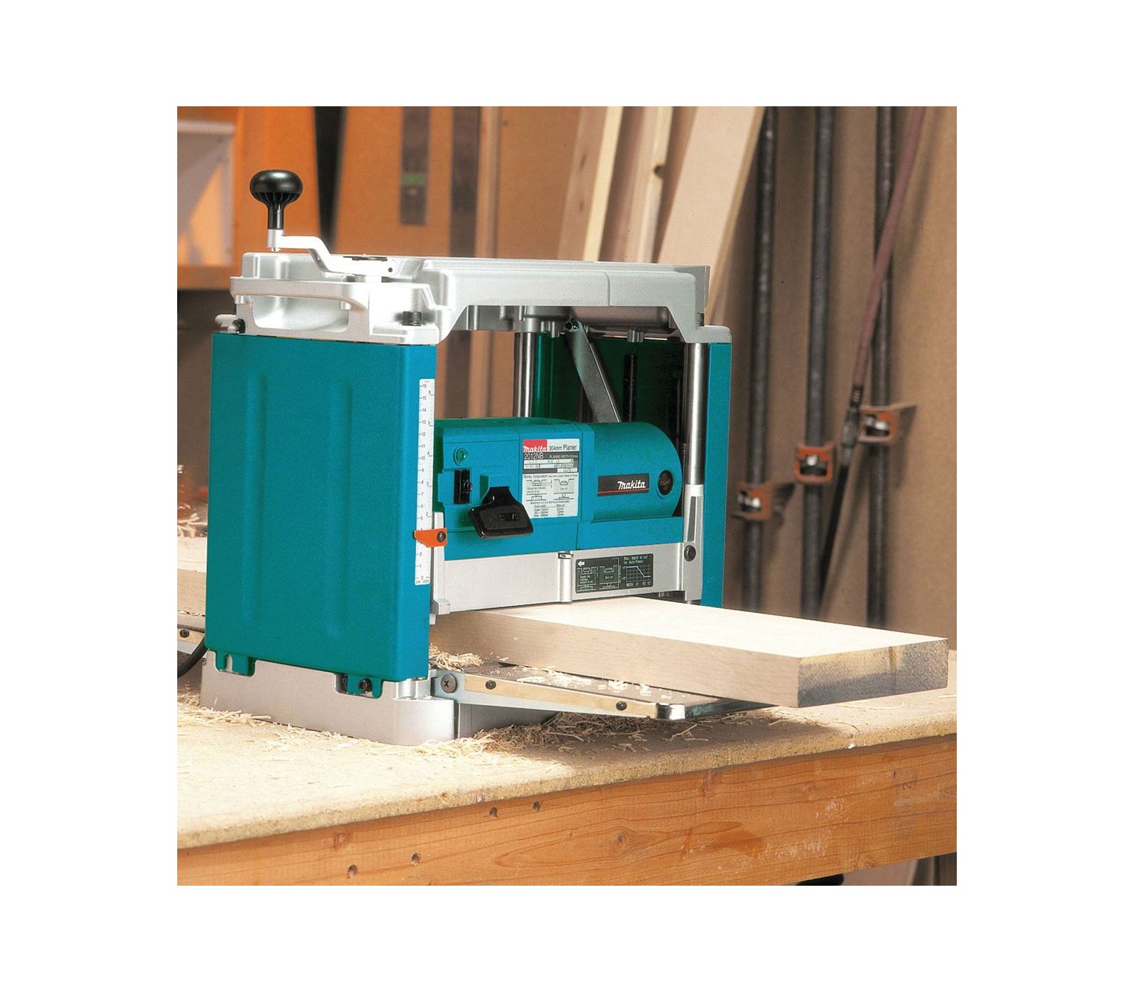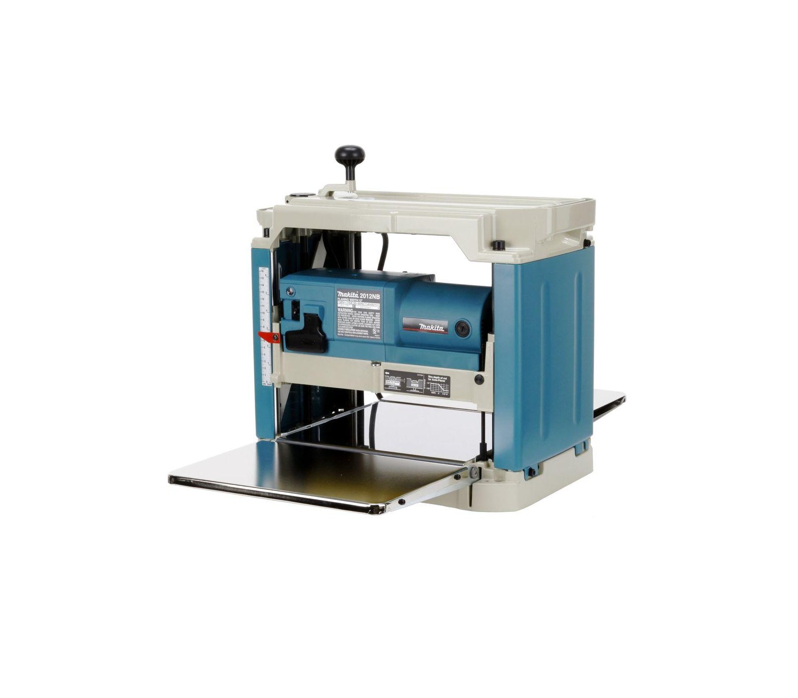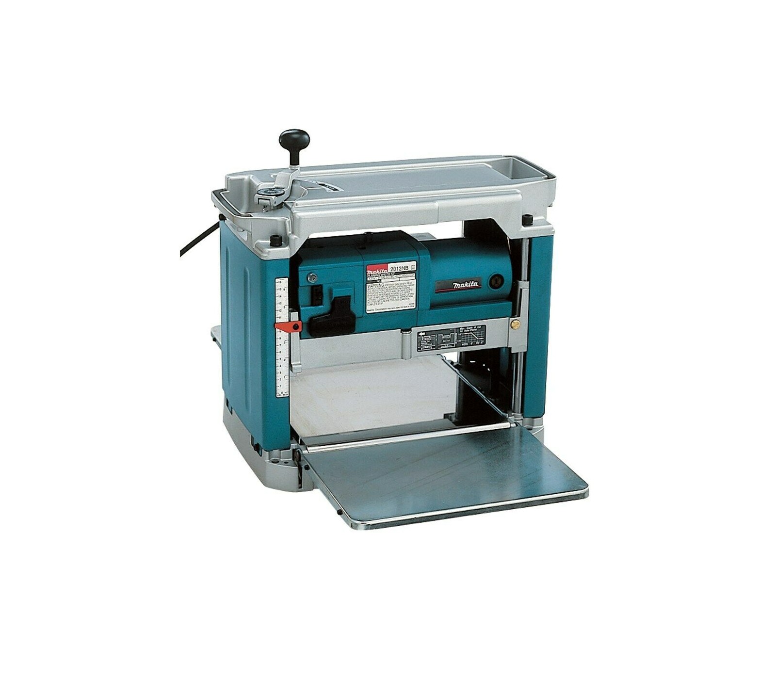 Makita 2012NB 1650 W reismusinės obliavimo staklės yra galingas ir kompaktiškas įrankis medienos paviršių lyginimui ir apdirbimui, su 304 mm pjovimo pločiu ir reguliuojamu gyliu iki 3 mm.