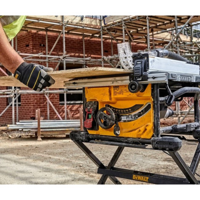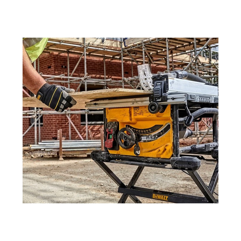 Dewalt DWE7485 išilginio pjovimo staklės su DE7400 darbastaliu – profesionalus rinkinys, skirtas tiksliems pjovimo darbams.