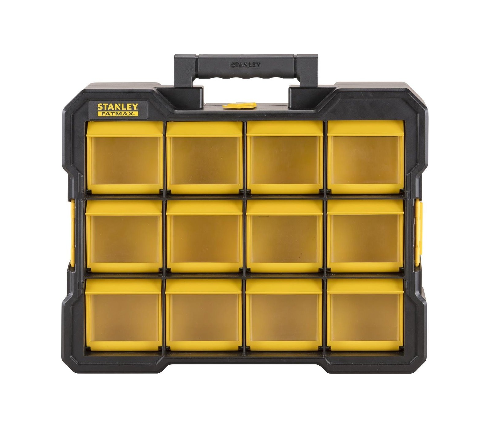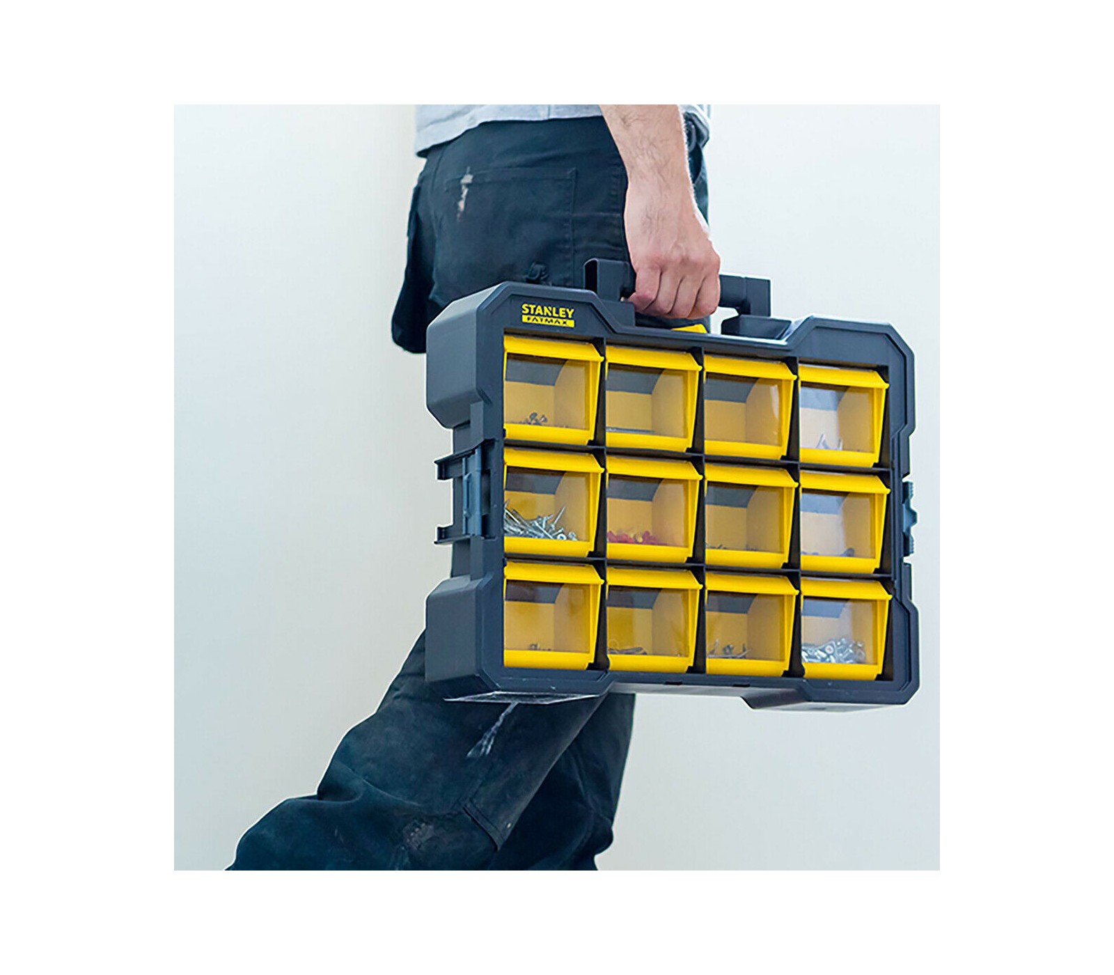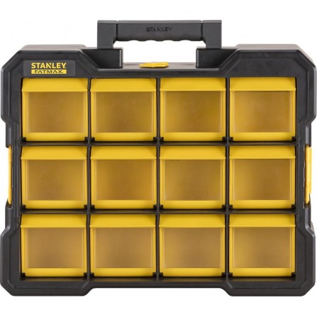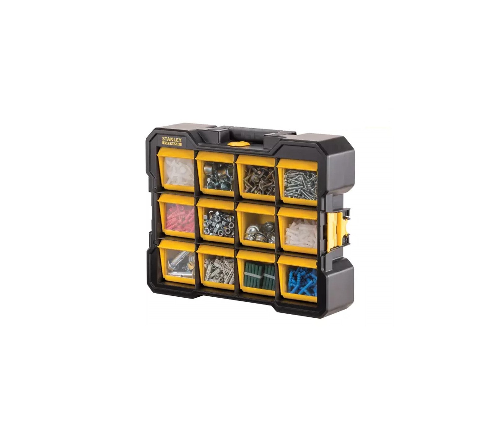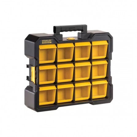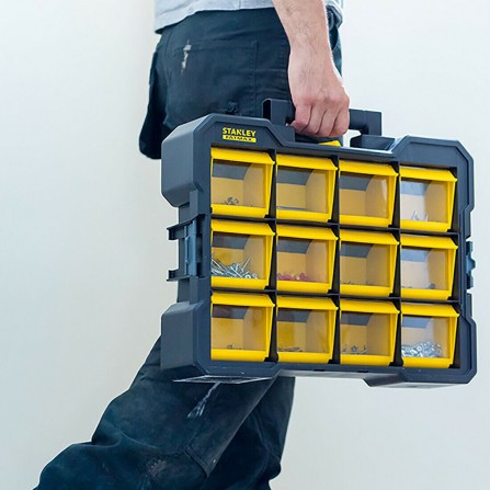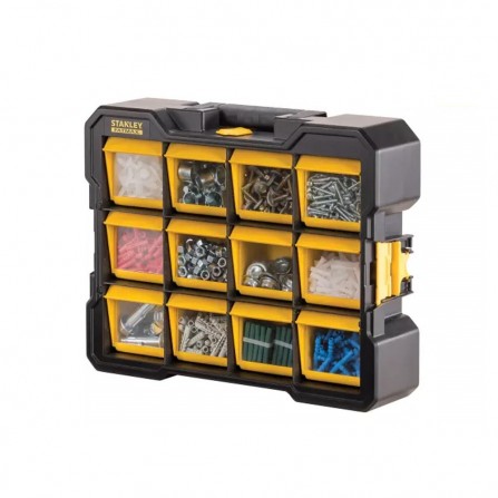 De Smulkių daiktų dėžė van STANLEY biedt een praktische oplossing voor het opbergen van kleine onderdelen. Met twaalf op voorraad gemonteerde, afneembare dozen en transparante deksels is het eenvoudig om de inhoud te bekijken en te ordenen. Het één-knops vergrendelmechanisme biedt gebruiksvriendelijkheid en maakt transport eenvoudig.