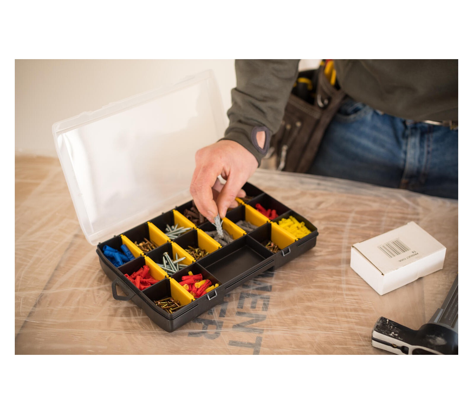 • 12 DĖŽUČIŲ IR NUIMAMI SKIRSTYTUVAI: Išimamos dėžutės mažoms dalims, komponentams ir reikmenims laikyti. Apatiniame lygyje yra nuimami skirstytuvai, kad būtų galima laikyti mažus įrankius.