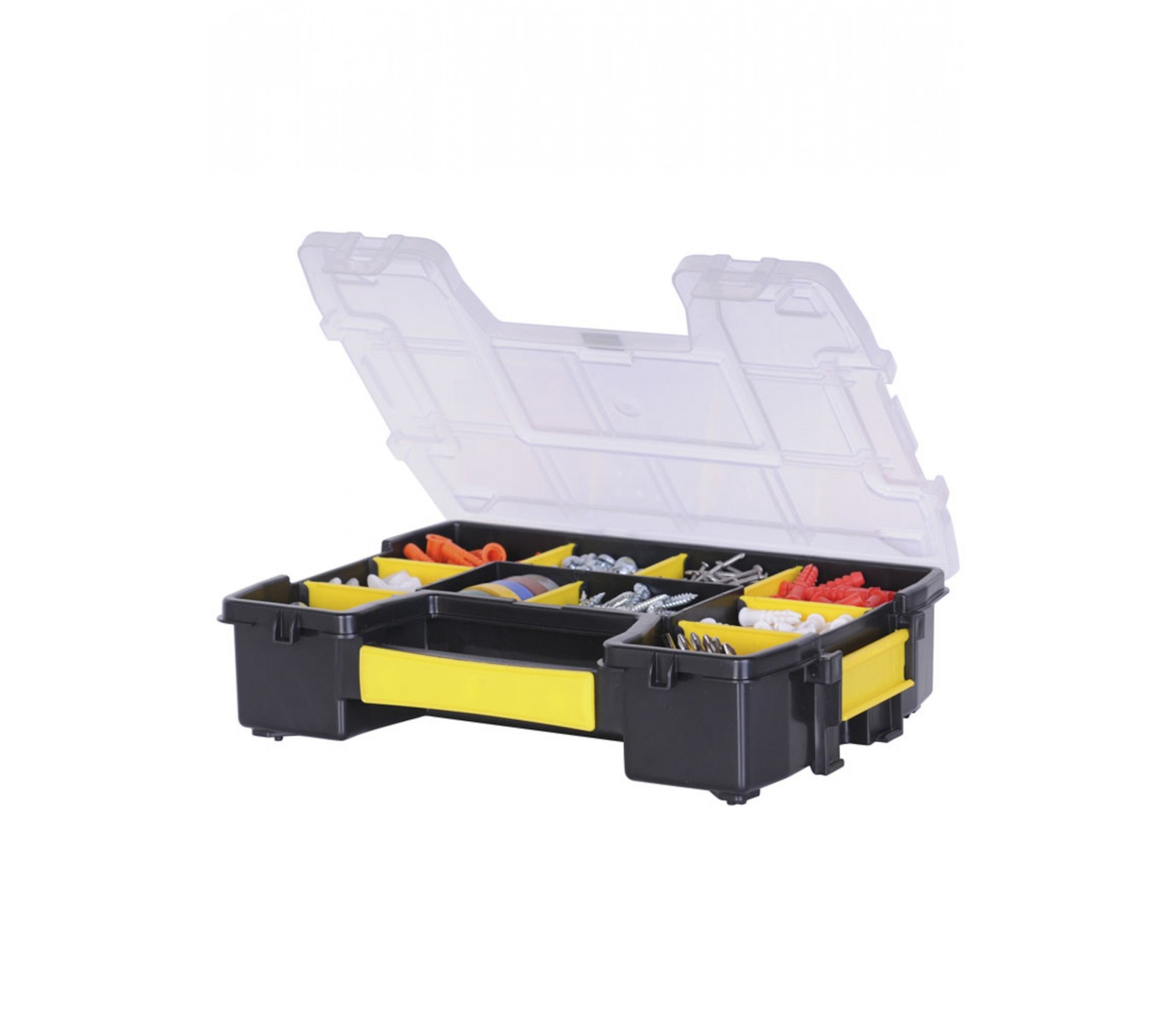 - De gereedschapsdoos heeft meerdere compartimenten, waardoor het gemakkelijk is om gereedschap te organiseren en snel te vinden.