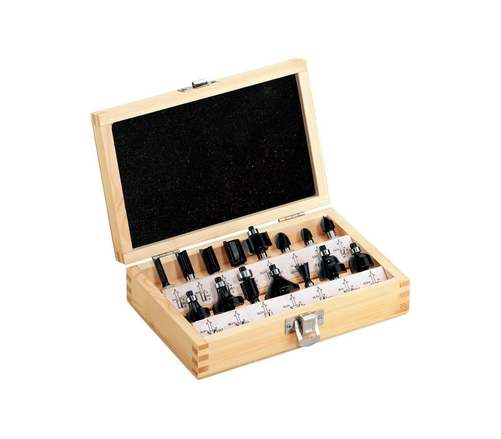 - 4 x groeffrezen: 6 mm, 10 mm, 12 mm, 16 mm, 3 x halfronde groeffrezen: 12,7 mm, R 6,3 mm, 9,5 mm, R 4,8 mm, 21,8 mm, R 6,3 mm, 1 x rand-/sleuffrees: 31,5 mm , 45°, 1 x V-groeffrees 12,7 mm, 90°, 2 x afrondfrees: 28,1 mm,