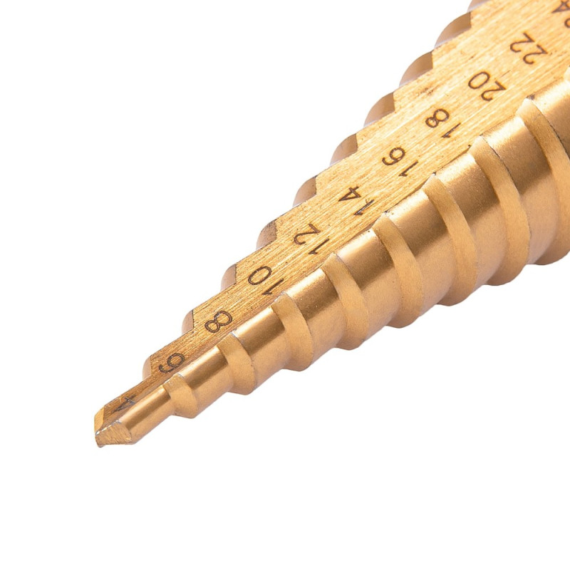 Metalas: Kokybiškas M2 plienas užtikrina grąžto ilgaamžiškumą ir tvirtumą. Titano danga (TIN) sumažina trinties efektą – grąžtas greičiau gręžia ir mažiau kaista (grąžtas naudojimas ilgiau). Forma ir konstrukcija:Žingsninis grąžtas – nuo 4 iki 20 mm. Kiekviena pakopa pagaląsta, kad gręžtų ir automatiškai valytųsi. Trigubas plokščias kotas tvirtai įsistato į elektrinių įrankių griebtuvą ir neslysta. Įrankis naudojamas:Spalvotam ir lengvajam metalui gręžti. Nerūdijančio plieno skardai gręžti. Plieno skardai gręžti. Plastikui gręžti.