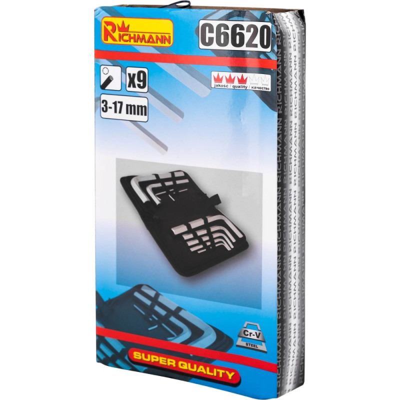 - Inbegrepen zijn 9 zeskantsleutels in maten van 3 tot 17 mm.