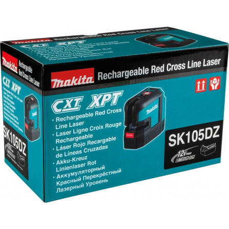 Makita SK105DZ is een 12V CXT® kruislijnlaser met horizontale en verticale lijnen (samen of afzonderlijk). Nauwkeurigheid ±0,3 mm/m. Bereik tot 25 m (80 m met ontvanger). IP54-stof- en waterbestendig. Tot 40 u werktijd met 4,0 Ah accu. Zonder accu en lader.