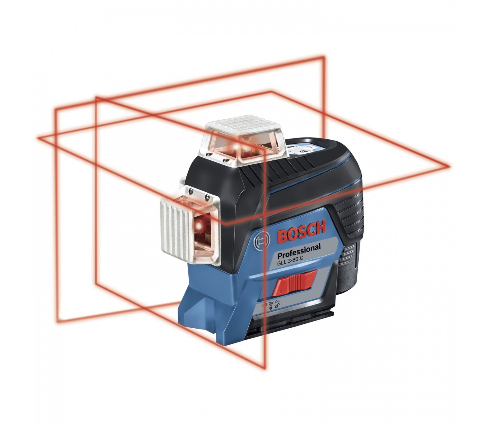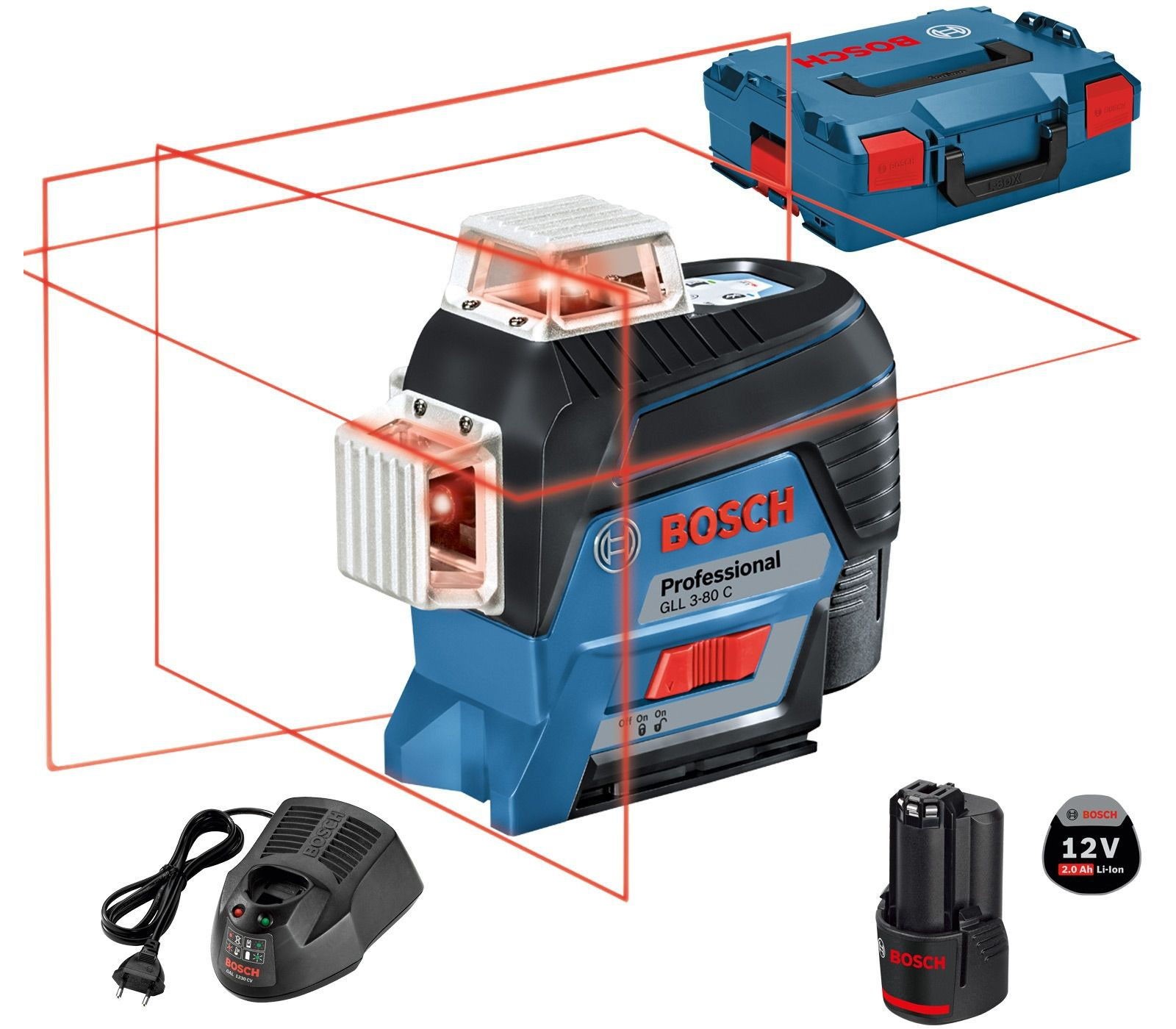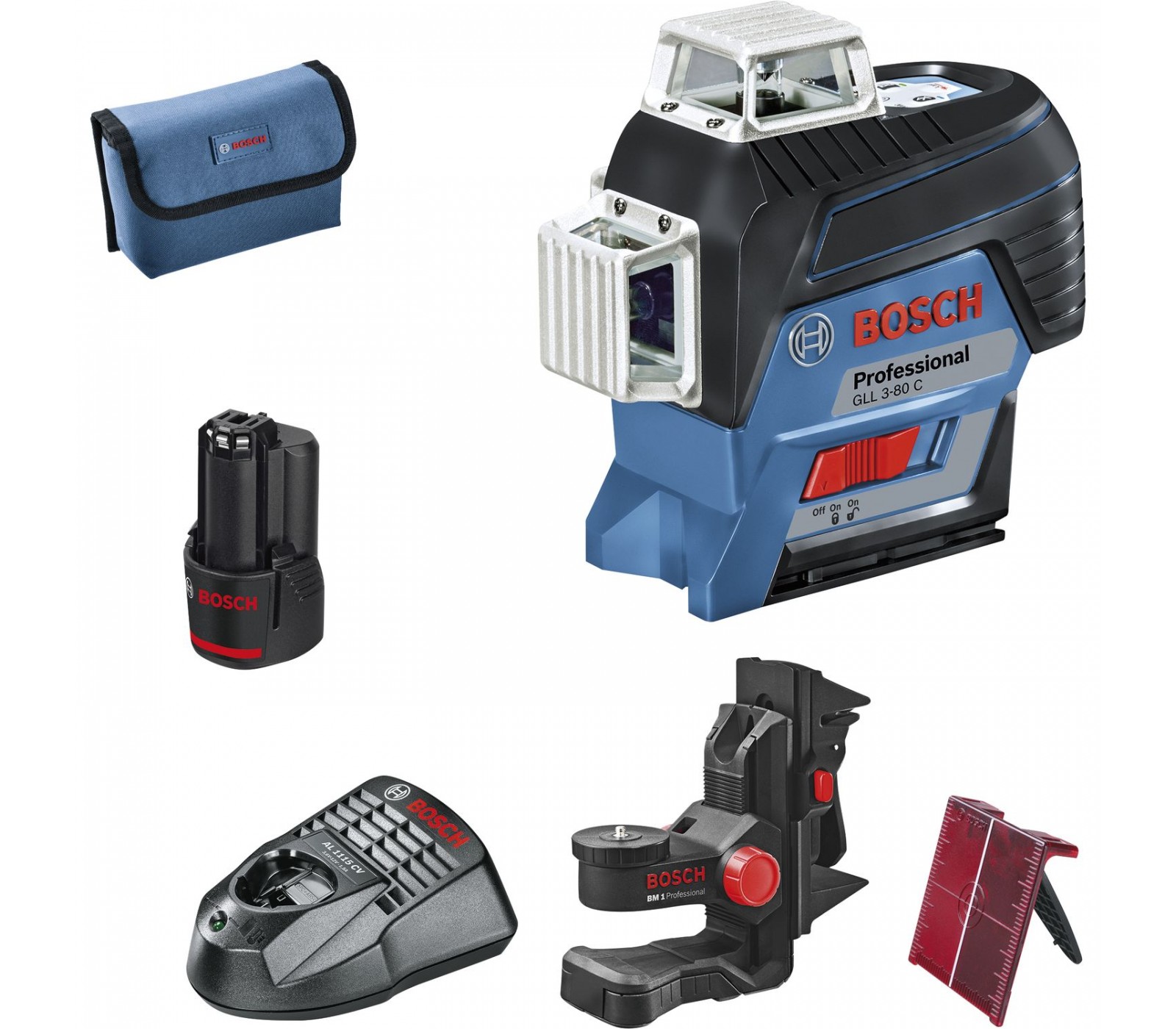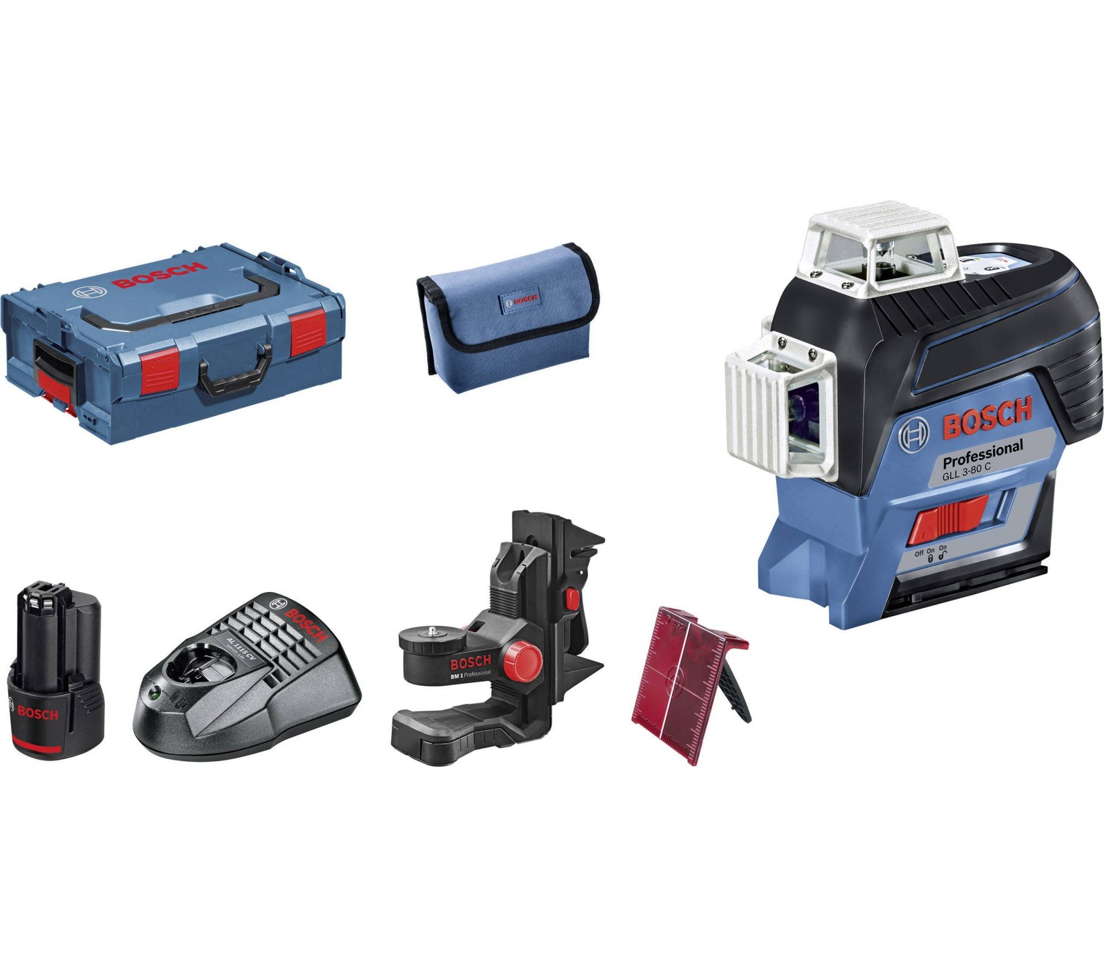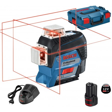 Akumuliatorinio linijinio nivelyro Bosch GLL 3-80 C (0601063R02) rinkinys, 12 V, 2 Ah, įkroviklis, lagaminas + priedai