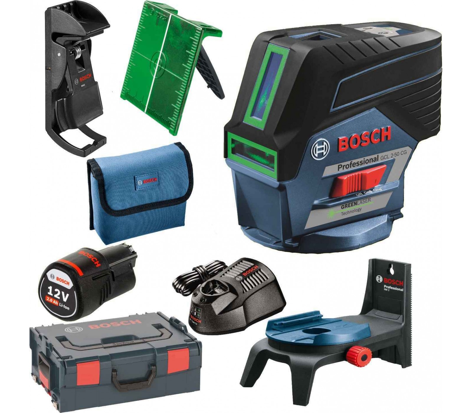 Akumuliatorinio žalio lazerinio nivelyro Bosch GCL 2-50 CG rinkinys, 12 V, 1 x 2,0 Ah, įkroviklis, lagaminas + priedai