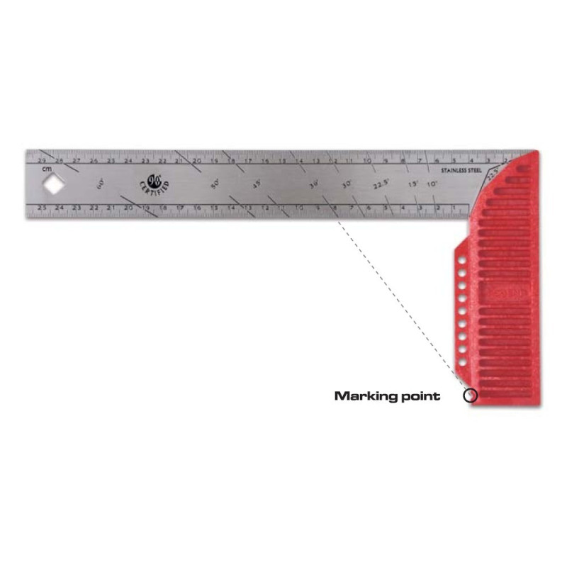 Deze kampainis met een kunststof handvat van 30 cm heeft een robuuste roestvrijstalen constructie en is voorzien van een gegraveerde maatstreep. Het biedt een ondersteuning die het mogelijk maakt om met één hand te meten. De schokbestendige handgreep van polymeer zorgt voor een comfortabele grip, terwijl de verschillende hellingsmetingen van 10°, 15°, 22,5°, 30°, 36°, 45°, 50° en 60° handig zijn voor diverse toepassingen.