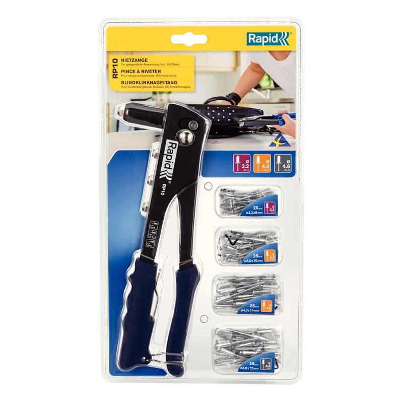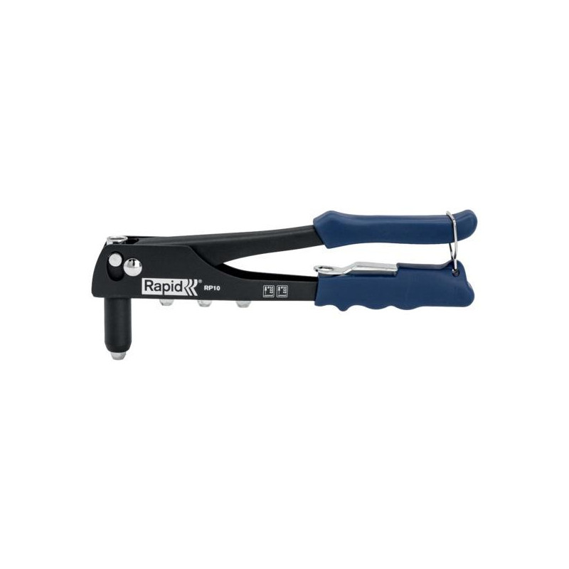 De Rapid RP10 klinknagelaar is een betrouwbaar hulpmiddel voor het eenvoudige en professionele bevestigen van metalen onderdelen. Met een lengte van 350 mm en een gewicht van 0,56 kg, is dit apparaat ontworpen voor gebruik met aluminium klinknagels van diverse maten, en wordt geleverd met 100 klinknagels, wat extra waarde biedt.