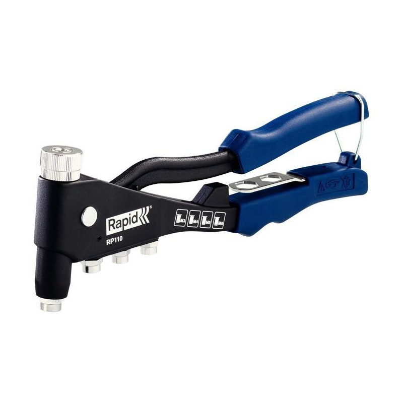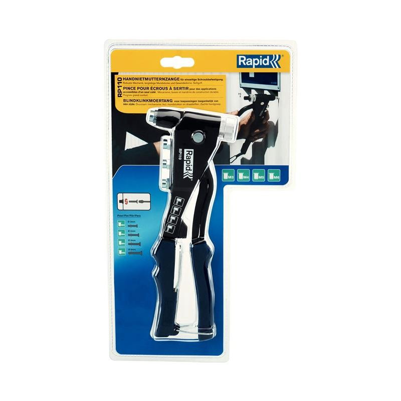 De Rapid RP110 is een veelzijdige klinktool met een lengte van 265 mm. Het biedt de mogelijkheid om verschillende maten klinknagels (M3, M4, M5, M6) te gebruiken, waaronder aluminium en stalen klinknagels. Het is licht in gewicht met slechts 0,7 kg en heeft een verlengde kop voor gebruiksgemak. Het product wordt geleverd zonder koffer en heeft een garantie van 24 maanden.