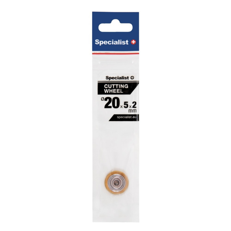 Kwaliteitsvolle snijwiel met een diameter van 20 x 5 x 2 mm, voorzien van een kogellager en een titanium coating, dat zorgt voor een nauwkeurige en betrouwbare snede. Het is geschikt voor "Specialist+" machines 09/3-005 en kan ook gebruikt worden met machines van andere fabrikanten.