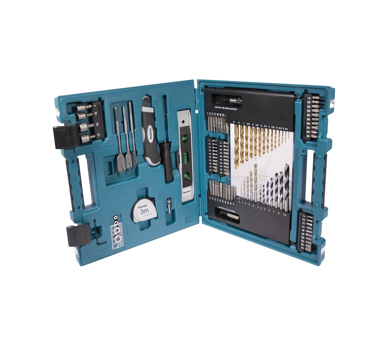 Grąžtų ir sukimo antgalių rinkinys Makita D-31778, 104 vnt. – universalus rinkinys darbams su metalais, mediena ir mūru. Pakuotėje yra 14 HSS-TiN grąžtų metalui, 10 grąžtų medienai, 6 mūro grąžtai, 1 įgilinimo antgalis, 5 gręžimo ribotuvai, 58 sukimo antgaliai, 2 laikikliai ir 4 varžtų sukimo galvos. Visas rinkinys supakuotas į plastikini dėklą, kuris užtikrina patogų ir tvarkingą laikymą. Iš viso 104 dalys, skirtos įvairiems gręžimo ir sukimo darbams.