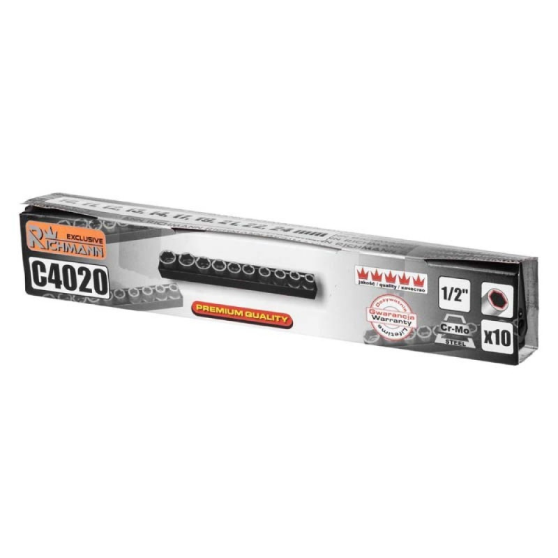 Dit is een set van tien slagkoppen variërend van 10 tot 24 mm, gemaakt van chroom-molybdeen staal (Cr-Mo). De set bevat de volgende maten: 10, 11, 12, 13, 14, 17, 19, 21, 22 en 24 mm. Het wordt gepresenteerd in een stevige metalen verpakking.