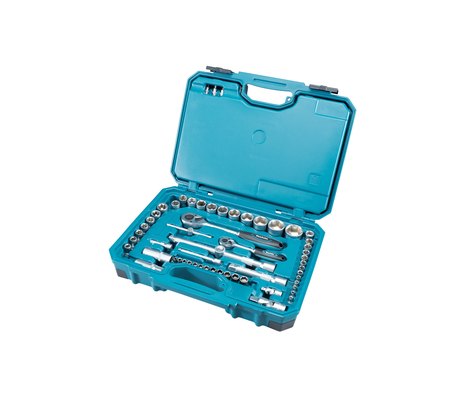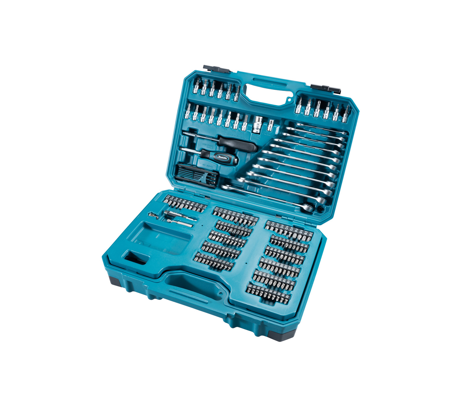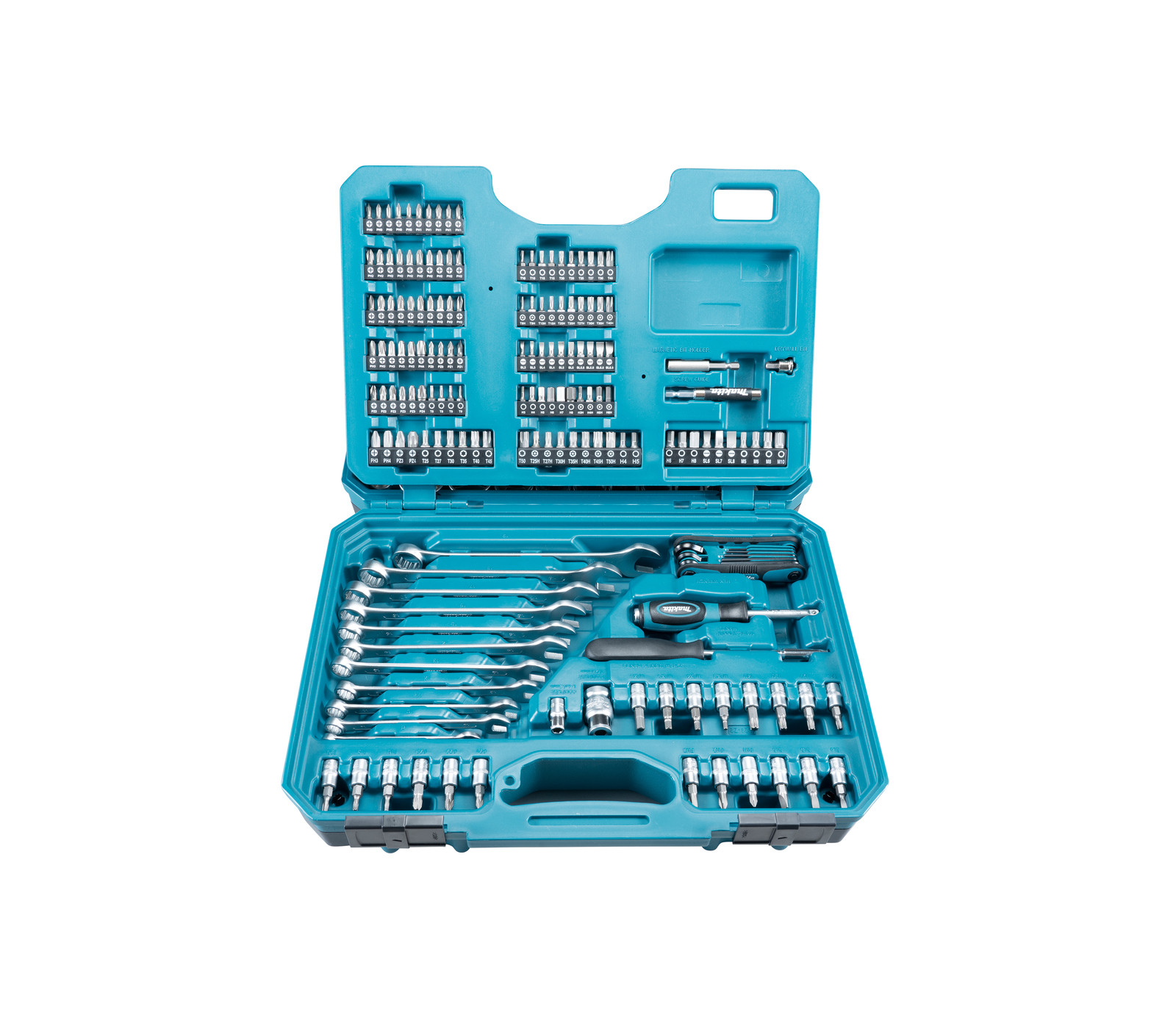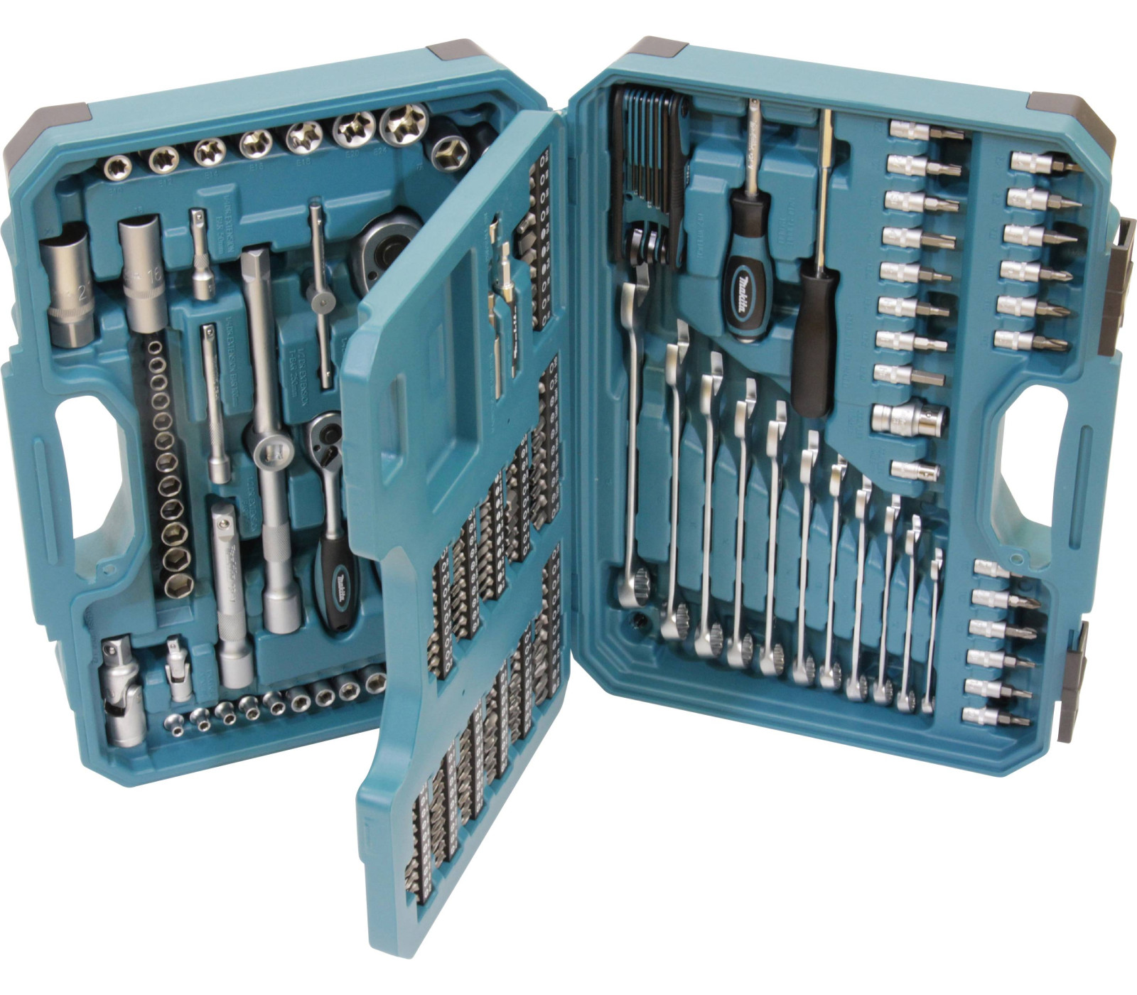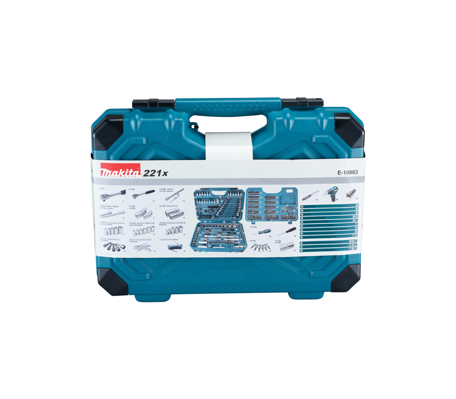 De Makita E-10883 is een 221-delig gereedschapsset. Bevat 120 bits, gipsbit, 2 bithouders, 12 doppen, 53 doppen, adapter, 2 universele koppelingen, 4 verlengstukken, 2 adapters, 5 handgrepen, 11 steeksleutels en 8 inbussleutels – alles in een kunststof koffer.