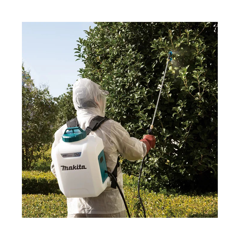 Makita DUS054Z is een 18V accuverstuiver met een 5 L tank. Milieuvriendelijk en stil (≤ 70 dB), met IP54-bescherming. Debiet tot 0,91 L/min bij 3 bar. Slang: 1,7 m. Gewicht met accu: 3,2–3,5 kg. Geleverd zonder accu en lader.