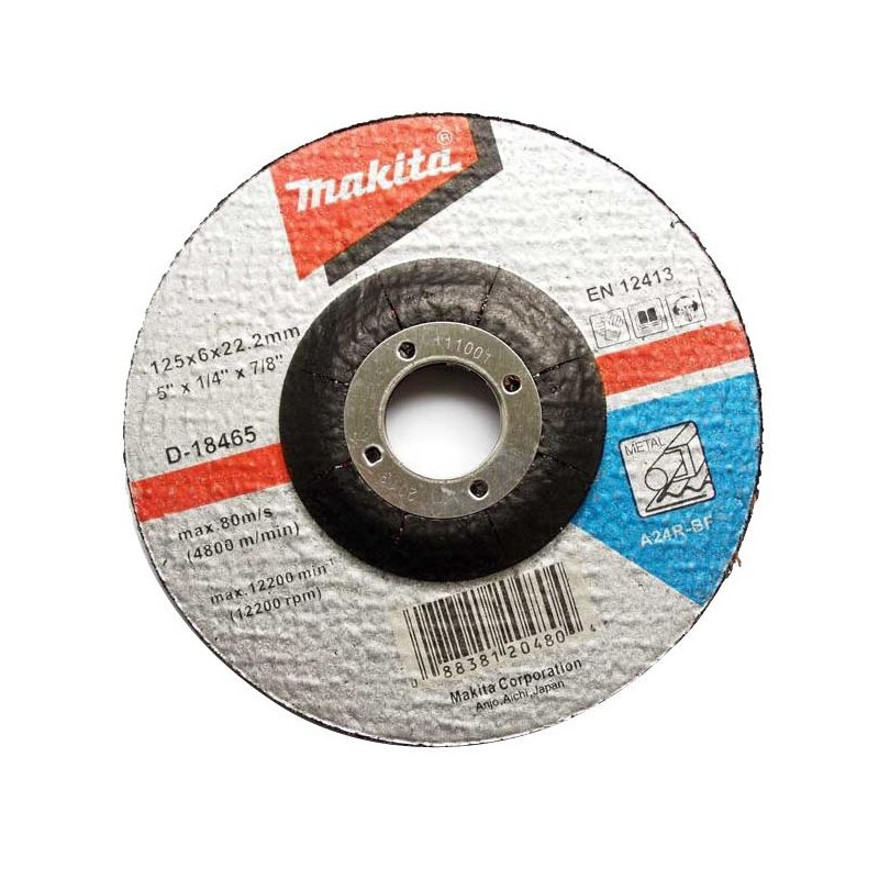 Prekės ženklas- Makita. Artikulas- D-18465. Storis- 6 mm. Skersmuo- 125 mm. Vidinės skylės skersmuo- 22.2 mm. Svoris- 0.228 kg. Medžiaga- Akmuo. Apdirbama medžiaga- Metalas, Nerūdijantysis plienas, Plienas. Grūdėtumas- 24 - 24. Maksimalus sūkių dažnis per minutę- 12200 rpm. Pjovimo greitis- 80 m/s. Tinka įrankiams- Kampiniams šlifuokliams.