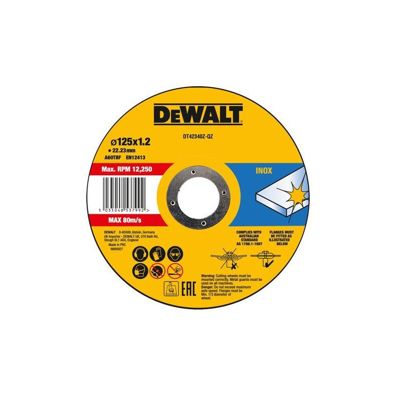 Prekės ženklas- Dewalt. Artikulas- DT42340Z-QZ. Storis- 1.2 mm. Skersmuo- 125 mm. Vidinės skylės skersmuo- 22.23 mm. Medžiaga- Metalų lydinys. Maksimalus sūkių dažnis per minutę- 12250 rpm. Pjovimo greitis- 80 m/s. Disko forma- Tiesus. Apdirbama medžiaga- Nerūdijantysis plienas. Vienetai pakuotėje- 1.