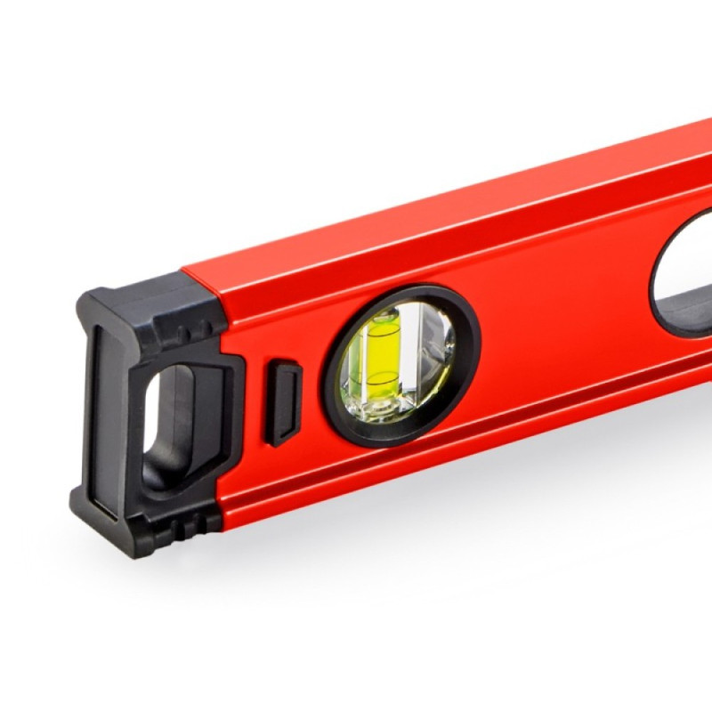 Features and characteristics: • Accuracy: 0.5 mm/m. 3 bubble vials for accurate measurement. • All bubble vials are electronically inspected ensuring a 100% accuracy. • Vertical view – the vertical bubble vial is visible from the top. • 480 g/m aluminium frame. • Thick aluminium profile. • Impact-absorbing rubber tips protect the tool from damage, even during falls from a considerable height. • The tool is commonly used for: carpentry work, construction work, door and window installation work.