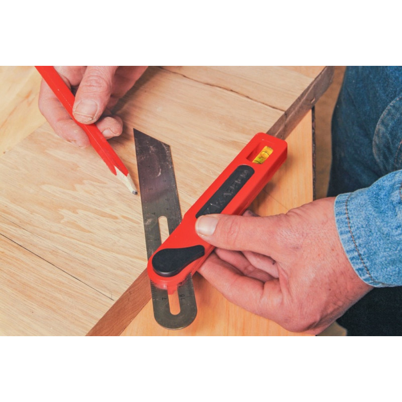 De Gulščiukas met verstelbare hoeken heeft een stevige constructie van roestvrij staal en kunststof, wat bijdraagt aan zijn duurzaamheid en gebruiksgemak. Het is ontworpen voor verschillende hoeken van 15°, 30°, 45°, 60° en 75°, wat het een veelzijdig hulpmiddel maakt voor bouw-, timmer- en metaalbewerkingswerkzaamheden.
